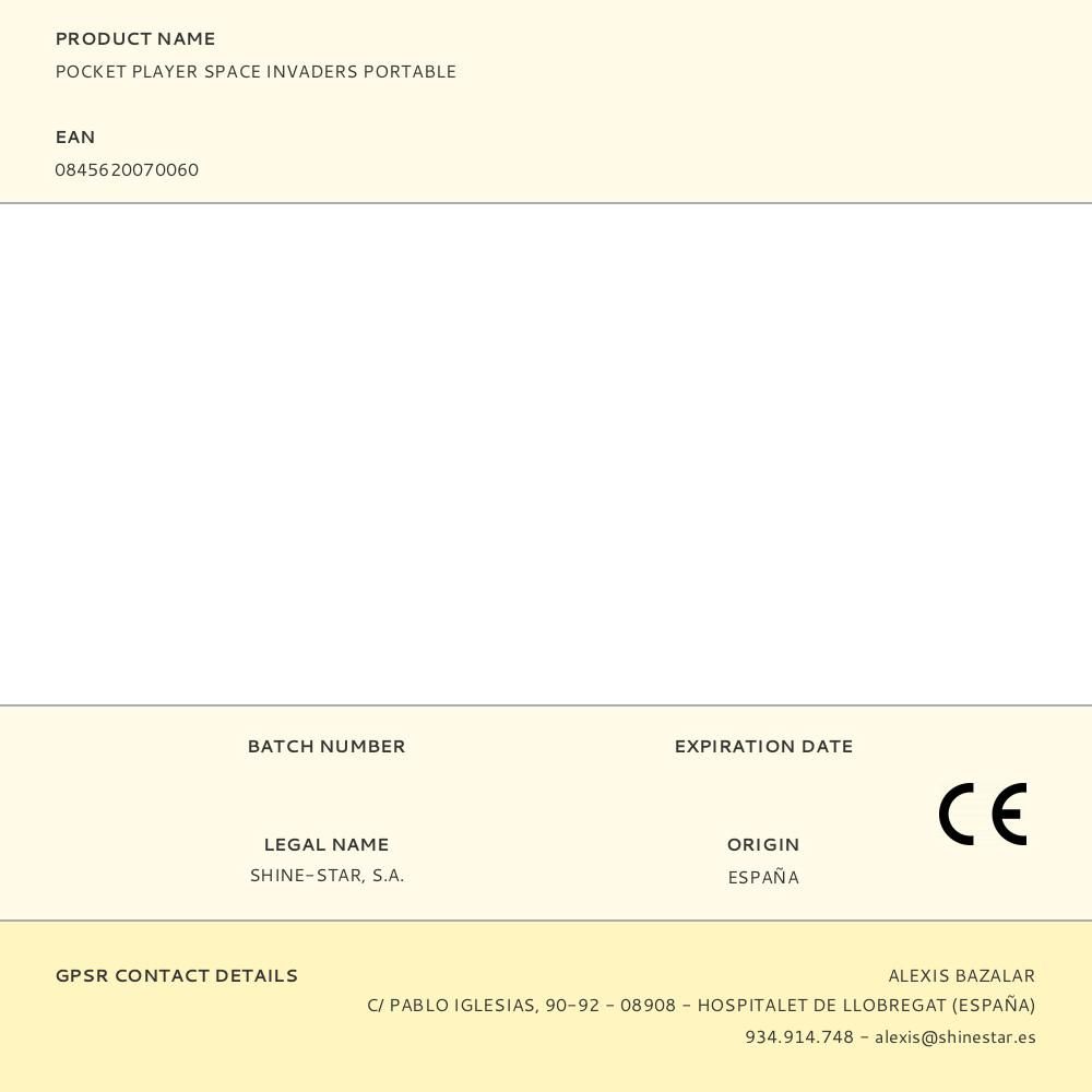 POCKET PLAYER PRO SPACE INVADERS PORTABLE GAMING SYSTEM - TÍTULO CON LICENCIA OFICIAL PANTALLA 2,75" DE ALTA RESOLUCIÓN A TODO COLOR. ALTAVOZ INCORPORADO CON CONTROL DE VOLUMEN. PUERTO DE AURICULARES DE 3,5 mm. BRILLO DE PANTALLA AJUSTABLE. ALIMENTADO POR 4 PILAS AA (NO INCLUIDAS) O UN CABLE USB-C (NO INCLUIDO). DISEÑO ERGONÓMICO. INCLUYE GUÍA DE USUARIO Y LANYARD