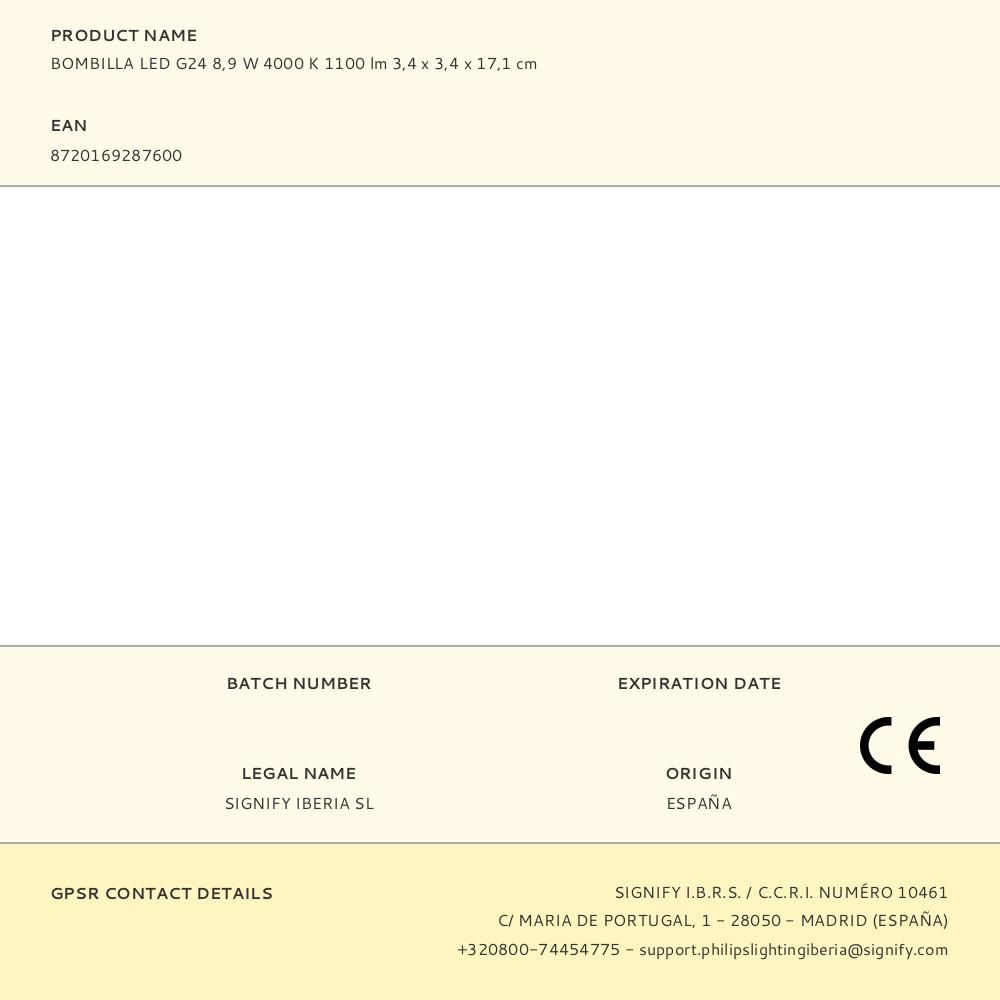 BOMBILLA LED G24 8.9 W (EQUIV. 26 W) 4000 K, 1100 lm, CRI 82, CLASIFICACIÓN ENERGÉTICA E, VIDA ÚTIL: 30.000 h, 220-240 V AC 50/60 Hz. FLUJO LUMINOSO 360°. DIMENSIONES: 3,4 x 3,4 x 17,1 cm