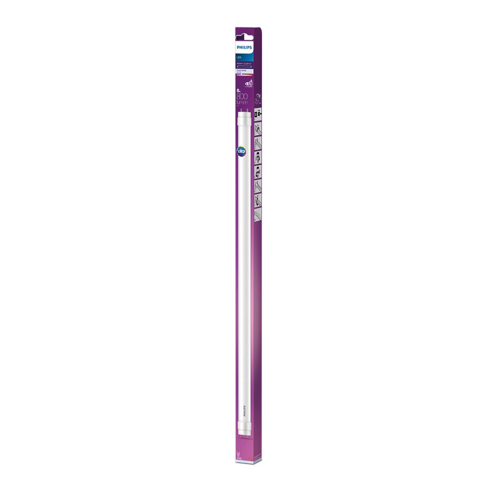 TUBO LED T8 8 W G13, 800 lm, LUZ DÍA 4000 K, CRI 80, CLASIFICACIÓN ENERGÉTICA F, VIDA ÚTIL: 15.000 h, 220 - 240 V AC 50/60 Hz. FLUJO LUMINOSO 360°. DIMENSIONES: Ø 2,8 x 60,4 cm