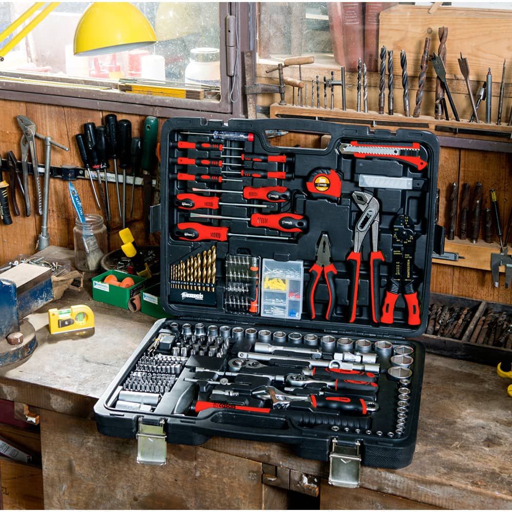 MALETÍN DE HERRAMIENTAS DE 303 PIEZAS PARA TODO TIPO DE TRABAJOS. JUEGO COMPLETO DE LLAVES DE VASO DE ¼ CON LLAVES DE 4 A 14 mm, JUEGO COMPLETO DE LLAVES DE VASO DE ½ CON LLAVES DE 10 A 32 mm. CADA JUEGO DE LLAVES CUENTA CON CARRACAS, CARDÁN Y PROLONGACIONES. INCLUYE OTRAS HERRAMIENTAS: CINTA MÉTRICA, DESTORNILLADORES DE TALLER Y DE PRECISIÓN, LLAVE INGLESA, MARTILLO, DETECTOR DE TENSIÓN, CÚTER Y ALICATES UNIVERSALES, EXTENSIBLES Y DE APRIETE - CUENTA CON UN AMPLIO SURTIDO DE PIEZAS PEQUEÑAS: TORNILLOS, CLAVOS, GOMAS Y TERMINABLES DE CABLE. MATERIAL DE ACERO AL CROMO-VANADIO. MALETÍN ROBUSTO Y RESISTENTE. INTERCAMBIO FÁCIL, RÁPIDO Y CÓMODO DE LOS ACCESORIOS. MEDIDAS: 50 x 39 x 8,5 cm