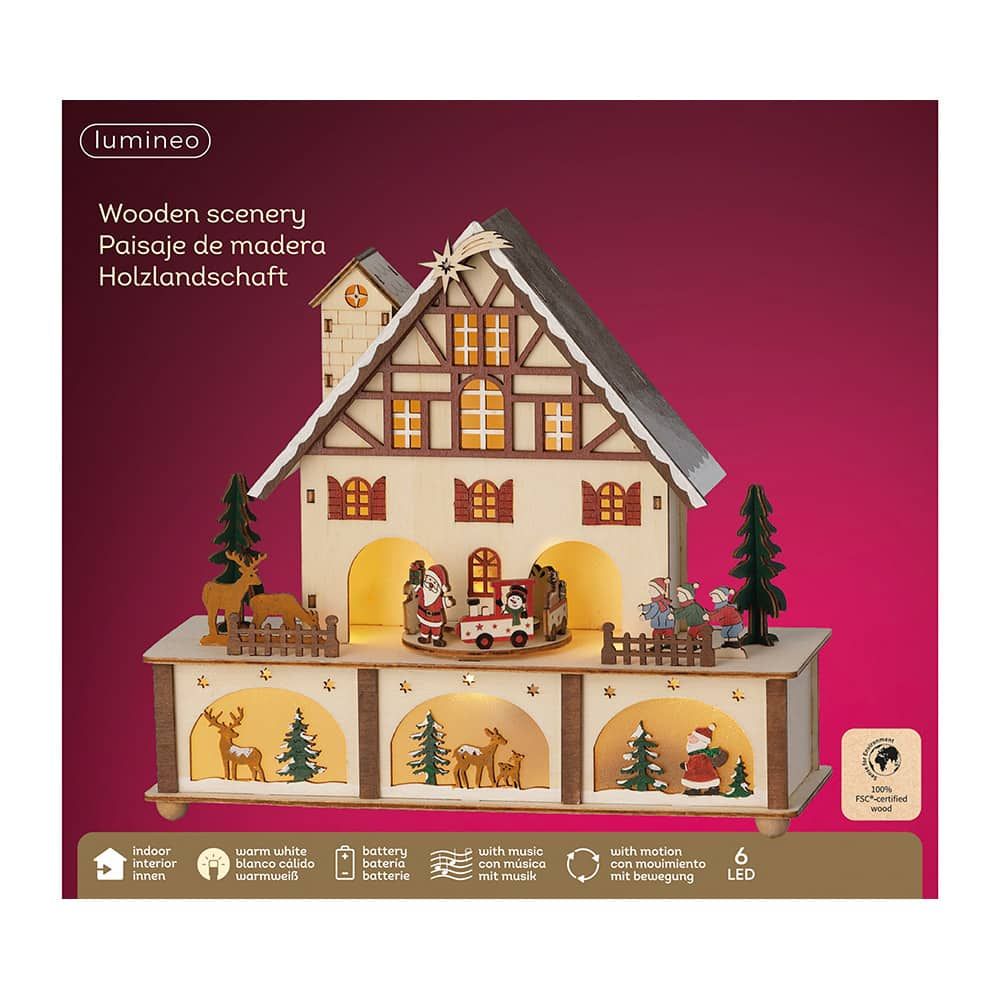 ESCENA NAVIDEÑA CON LED, MOVIMIENTO Y MÚSICA. MATERIAL: MADERA CONTRACHAPADA. FUNCIONES: FIJA. USO: INTERIOR. COLOR LED: LUZ CÁLIDA. FUNCIONA CON PILAS 3 x AAA ( NO INCLUIDAS). MEDIDAS: 27,00 x 24,30 x 10,00 cm