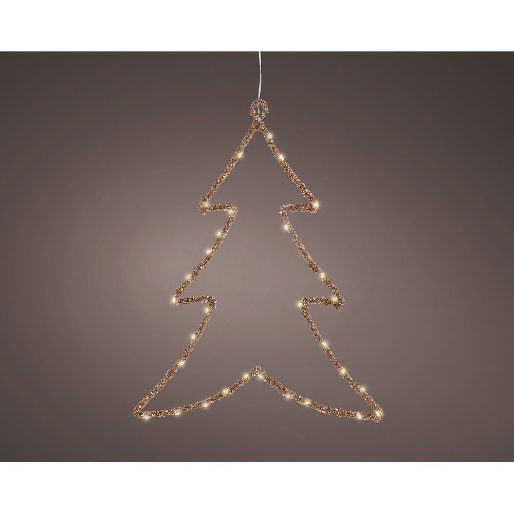 LUZ LED DECORATIVA ÁRBOL, COLOR DORADO, 40 LEDS, MATERIAL: METAL, FUNCIÓN FIJA, USO INTERIOR. LUZ LED CÁLIDA. FUNCIONA CON PILAS 2 x AA (NO INCLUIDAS). TEMPORIZADOR: 6 h ENCENDIDO / 18 h APAGADO. MEDIDAS: 34 x 46 cm