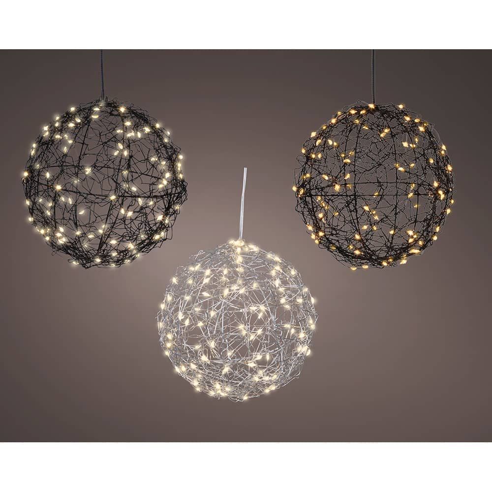 BOLA LED METAL, 60 LEDS, FUNCIÓN FIJA, FUNCIONA CON PILAS 3 x AA, CON TEMPORIZADOR 6 h ENCENDIDA/18 h APAGADA, CABLE DE ALIMENTACIÓN NEGRO DE 30 cm, COLORES SURTIDOS, EXTERIOR, Ø15 cm