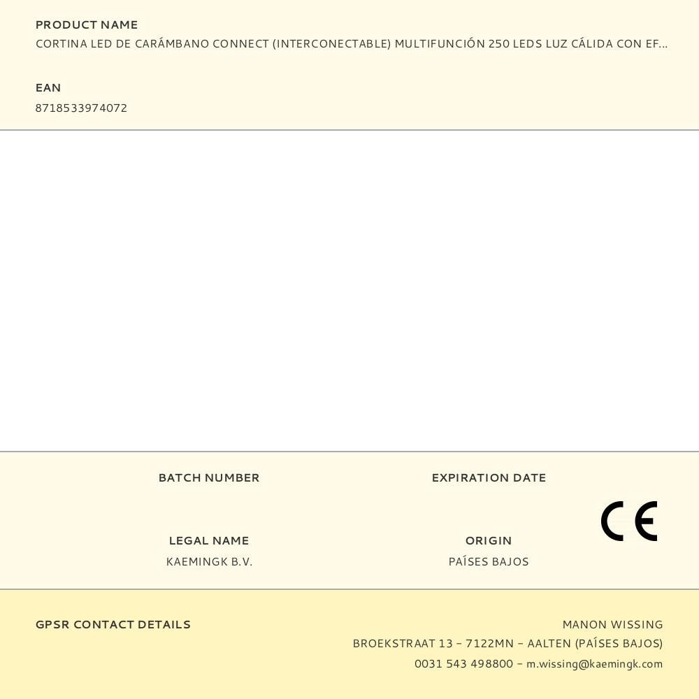 CORTINA LED DE CARÁMBANO CONNECT (INTERCONECTABLE) MULTIFUNCIÓN 250 LEDS LUZ CÁLIDA CON EFECTO INTERMITENTE 220 - 240 V 50/60 Hz, IP44, CABLE BLANCO, PERMITE CONECTAR HASTA 3000 LEDS CON EL TRANSFORMADOR DE 12 W, 8 FUNCIONES, ADAPTADOR CE, CABLE ALIMENTACIÓN 5 cm, DISTANCIA ENTRE TIRAS COLGANTES 16 cm, LONGITUD CAIDA TIRAS MÁX. 70 cm, DISTANCIA ENTRE LA PRIMERA Y LA ÚLTIMA TIRA 7,35 m, LARGO TOTAL 12,35 m - TEMPORIZADOR: 8 h ENCENDIDO / 16 h APAGADO, INCLUYE TRANSFORMADOR 12 W