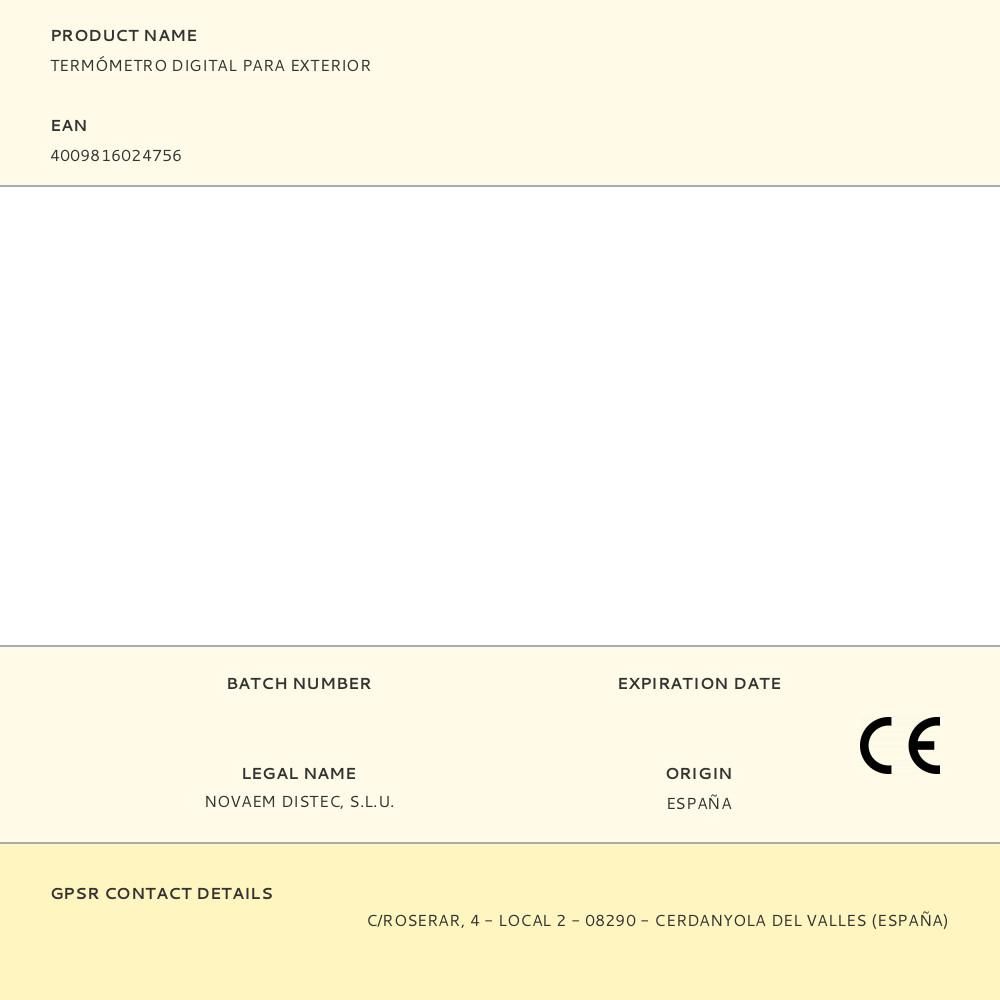 TERMÓMETRO DIGITAL PARA EXTERIOR, RESISTENTE AL AGUA. CON RANGO DE TEMPERATURA -20 / +50 °C. ALIMENTACIÓN: 2 x PILAS AAA (NO INCLUIDAS)