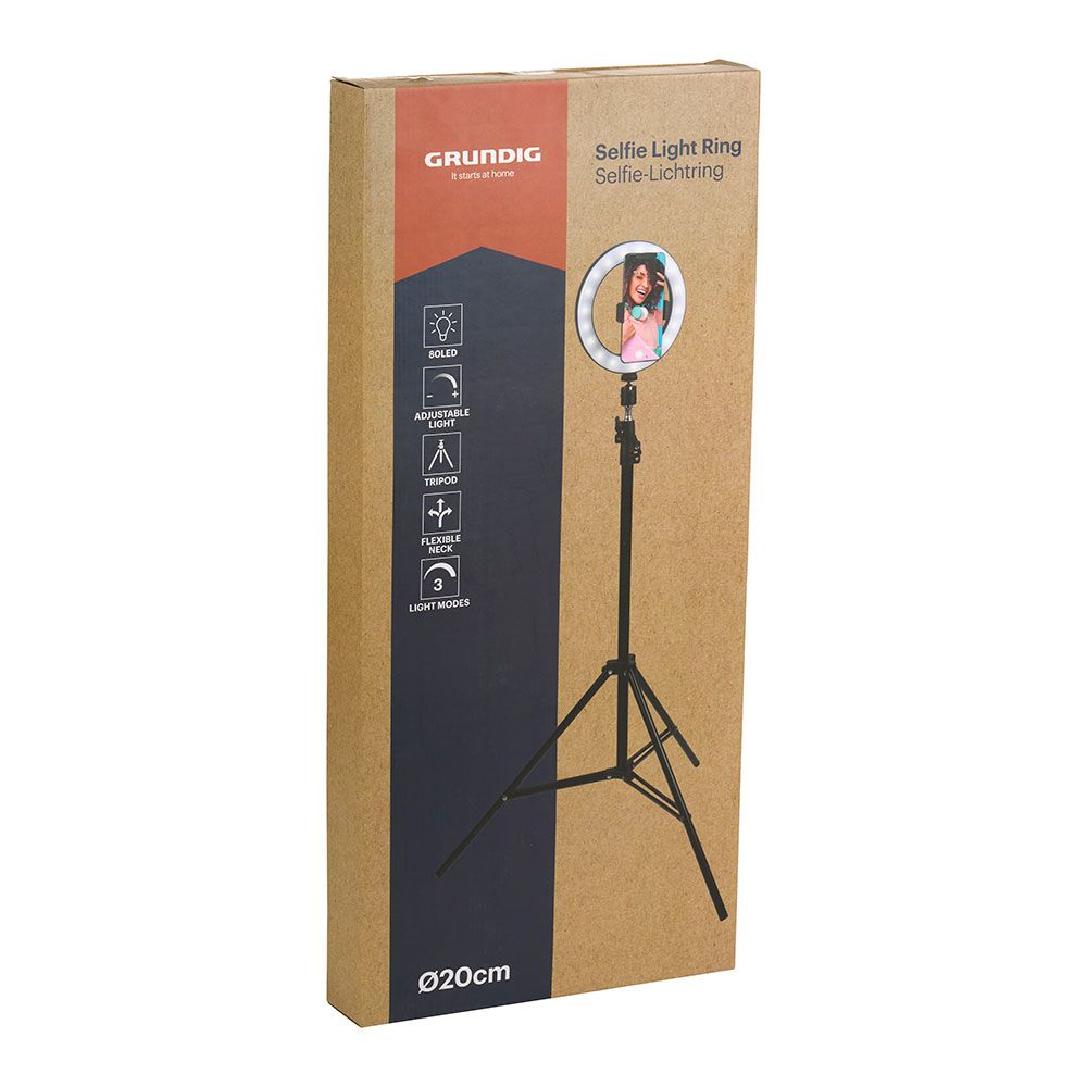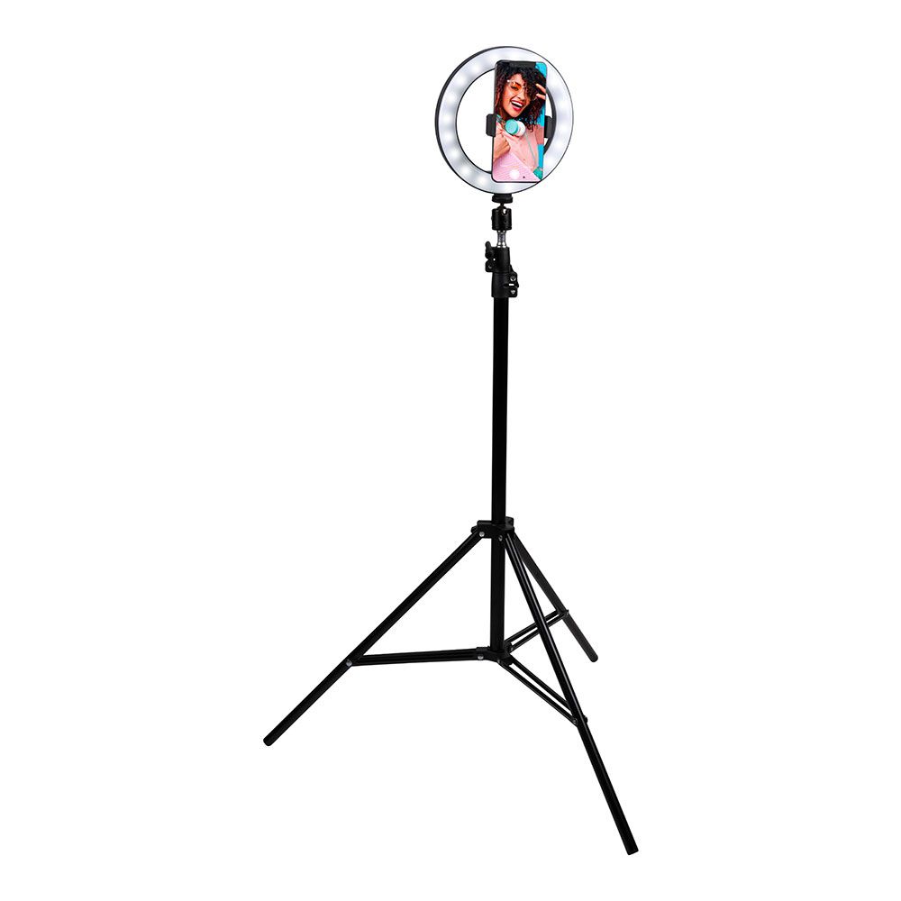 ANILLO DE LUZ CON TRIPODE PARA SELFIES. Ø20 cm, 80 LEDS CON TRES TONALIDADES DE COLOR, INTENSIDAD DE LUZ REGULABLE, GIRO 360°, CUELLO FLEXIBLE, SOPORTE GIRATORIO PARA TELÉFONO MÓVIL, TRÍPODE EXTENSIBLE HASTA 210 cm, CONEXIÓN USB-A, CABLE DE 2 m