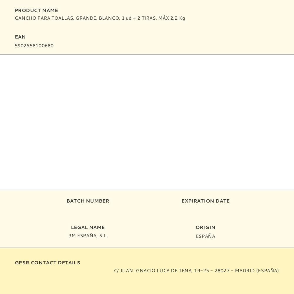 COMMAND GANCHO PARA TOALLAS, GRANDE, BLANCO, 1 ud + 2 TIRAS, MÁX 2,2 Kg
