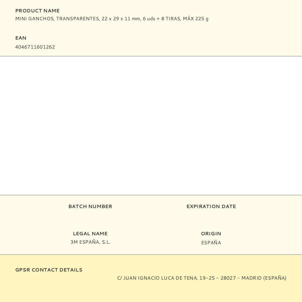 COMMAND MINI GANCHOS, TRANSPARENTES, 22 x 29 x 11 mm, 6 uds + 8 TIRAS, 17006CLR, CARGA MÁXIMA 225 g