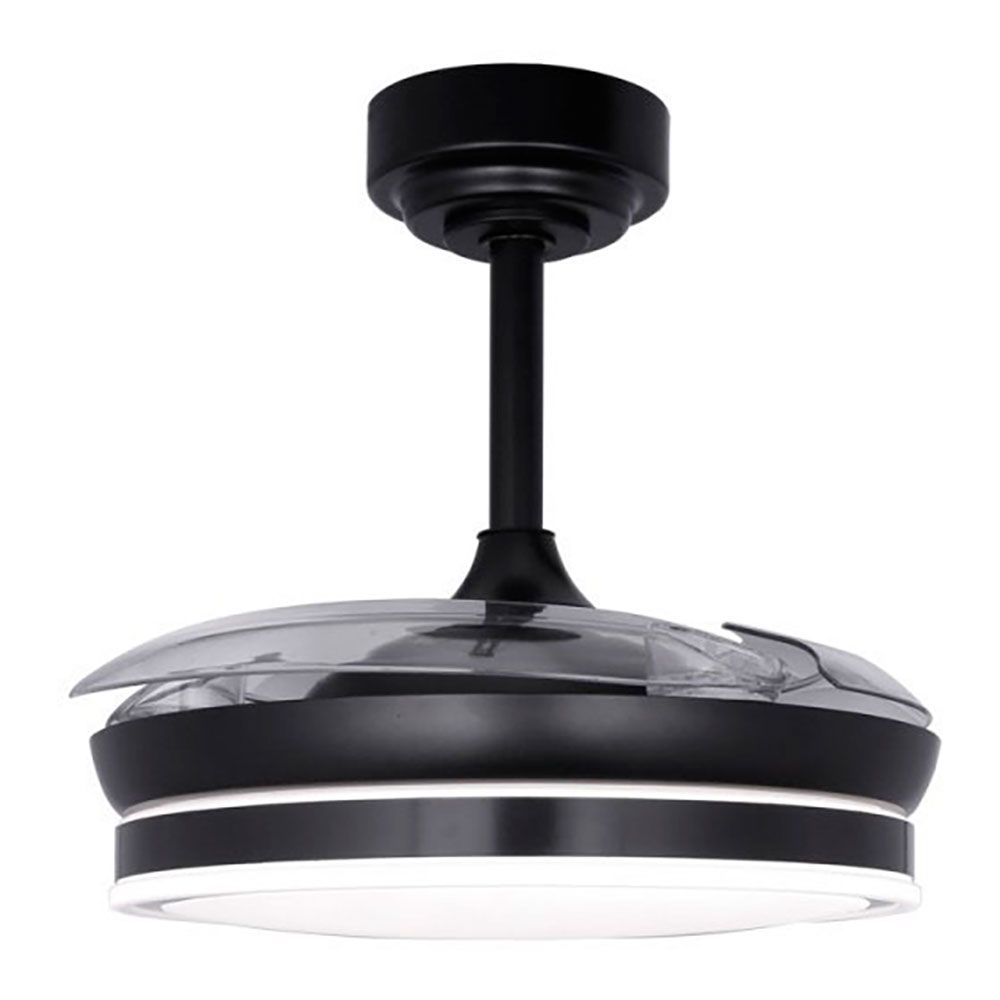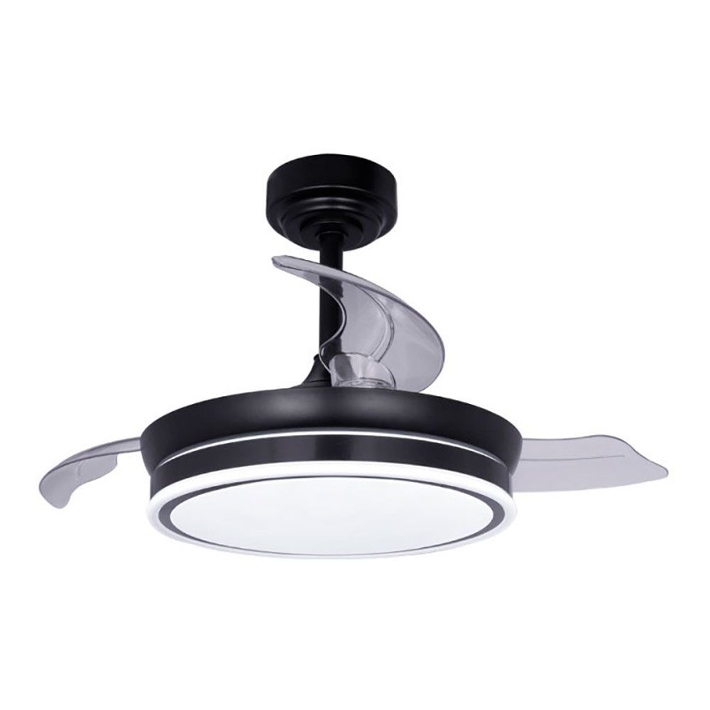 VENTILADOR DE TECHO NEGRO, LED 3CCT, MODELO MOSS MINI, ULTRA SILENCIOSO, CON 3 ASPAS RETRÁCTILES DE ABS TRANSPARENTES - CON MOTOR DC, 46 W, IP20 - dB MÁX 39. DIMMABLE, TIPO DE LUZ: LUZ CÁLIDA 3000 K, LUZ DÍA 4000 K, LUZ FRÍA 5700 K, 5520 lm, 6 VELOCIDADES. RPM MÁX 260. FUNCIÓN INVERSA INVIERNO-VERANO, FUNCIÓN BRISA, TEMPORIZADOR 1/2/4 h, MEMORIA DE ENCENDIDO CCT, LUZ NOCHE - CON MANDO A DISTANCIA Y SOPORTE DE PARED PARA MANDO INCLUIDOS (PILAS 2 x AAA NO INCLUIDAS). FLUJO DEL AIRE: MÁX. 5580 m³/h. VIDA ÚTIL: 20.000 h. 220-240 V 50 Hz, DIMENSIONES: CON ASPAS Ø92 cm, PLAFÓN Ø39 cm, ALTURA 32 - 42 cm