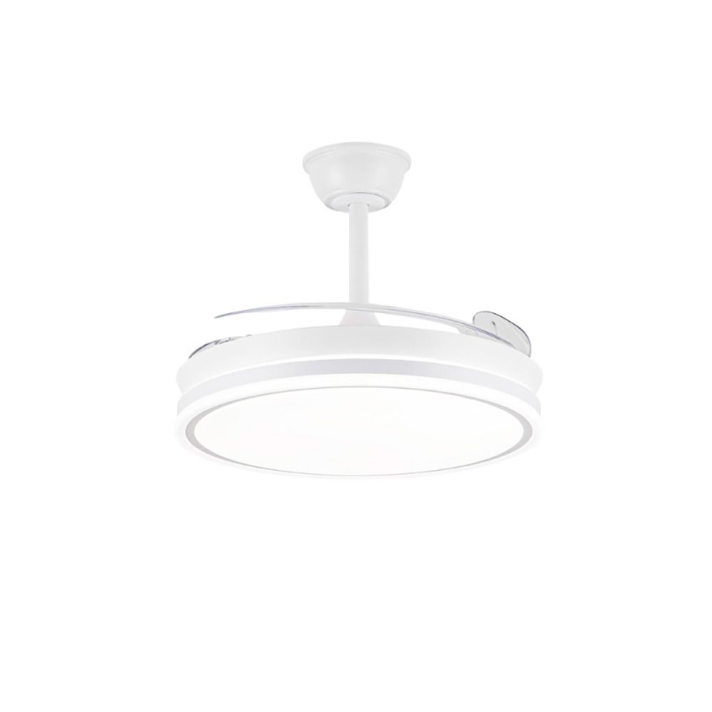 VENTILADOR DE TECHO BLANCO LED 3CCT MODELO EVO SMART, SILENCIOSO, CON 3 ASPAS RETRÁCTILES DE ABS TRANSPARENTES, CON MOTOR DC, 72 W, IP20 - dB MÁX 43. DIMMABLE, TIPO DE LUZ: LUZ CÁLIDA 3000 K, LUZ DÍA 4000 K, LUZ FRÍA 5700 K, 7920 lm, 6 VELOCIDADES. RPM MÁX 268. FUNCIÓN INVERSA INVIERNO-VERANO, FUNCIÓN BRISA, TEMPORIZADOR 1/2/4 h, MEMORIA DE ENCENDIDO CCT, LUZ NOCHE - CON MANDO A DISTANCIA Y SOPORTE DE PARED PARA MANDO INCLUIDOS (PILAS 2 x AAA NO INCLUIDAS) O CON TU SMARTPHONE VÍA APP SMART DESCARGABLE CON QR. FLUJO DEL AIRE MÁX. 6580 m³/h. VIDA ÚTIL: 20.000 h, 220-240 V, 50 Hz, DIMENSIONES: CON ASPAS Ø106 cm, PLAFÓN Ø48,5 cm, ALTURA 32 - 42 cm