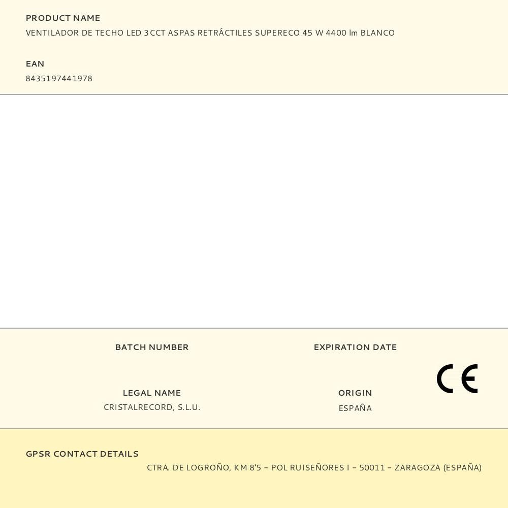 VENTILADOR DE TECHO BLANCO LED 3CCT MODELO SUPERECO, SILENCIOSO, CON 3 ASPAS RETRÁCTILES DE ABS TRANSPARENTES - CON MOTOR DC, 45 W, IP20 - dB MÁX 37,8. DIMMABLE, TIPO DE LUZ: LUZ CÁLIDA 3000 K, LUZ DÍA 4000 K, LUZ FRÍA 5700 K, 4400 lm, 6 VELOCIDADES. RPM MÁX 245. FUNCIÓN INVERSA INVIERNO-VERANO, FUNCIÓN BRISA, TEMPORIZADOR 1/2/4 h, MEMORIA DE ENCENDIDO CCT - LUZ NOCHE - CON MANDO A DISTANCIA Y SOPORTE DE PARED PARA MANDO INCLUIDOS (PILAS 2 x AAA NO INCLUIDAS). FLUJO DEL AIRE: MÁX. 5730 m³/h. VIDA ÚTIL: 20.000 h, 220-240 V 50 Hz, DIMENSIONES: CON ASPAS Ø106 cm, PLAFÓN Ø48,5 cm, ALTURA 32 - 42 cm