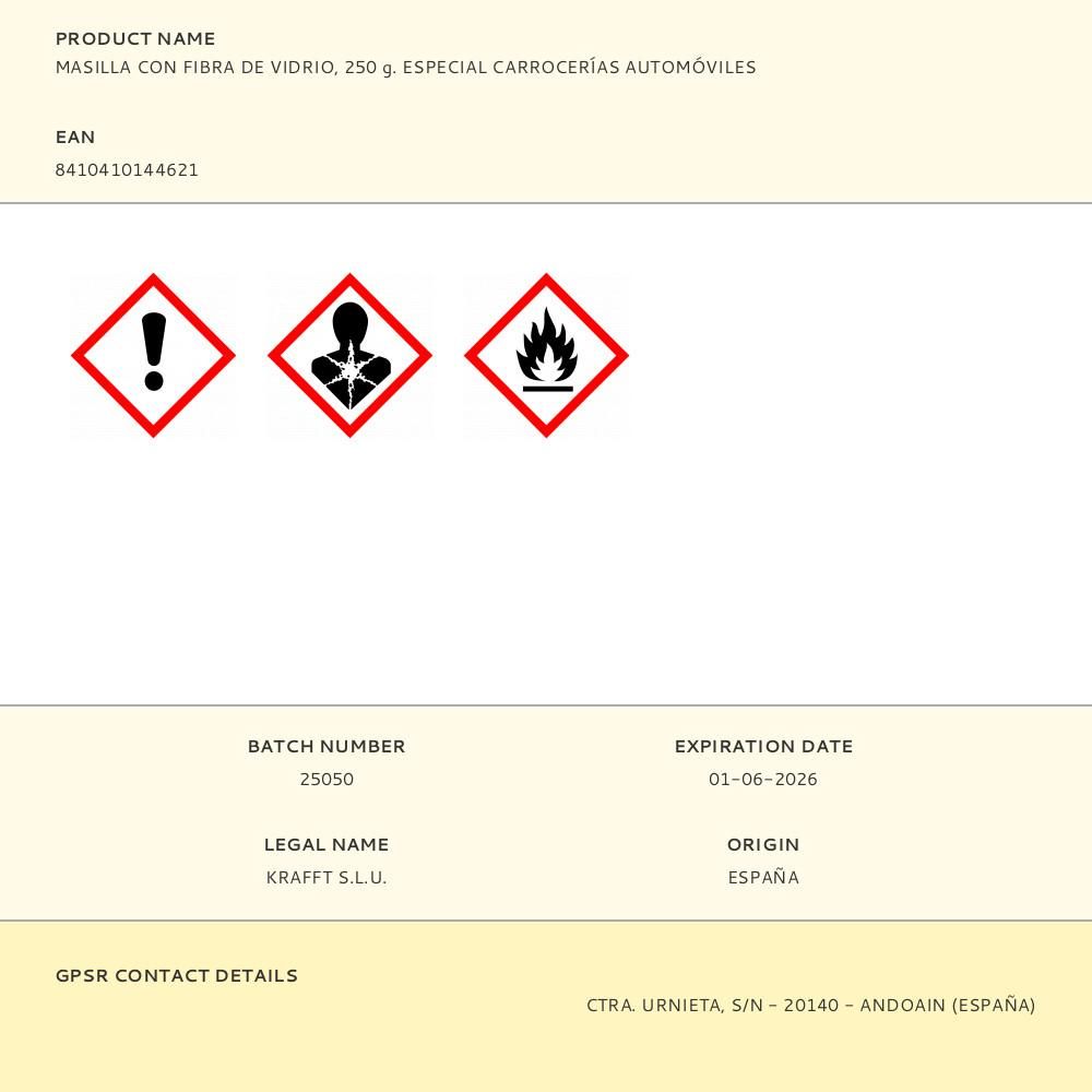 MASILLA CON FIBRA DE VIDRIO, 250 g. ESPECIAL CARROCERÍAS AUTOMÓVILES