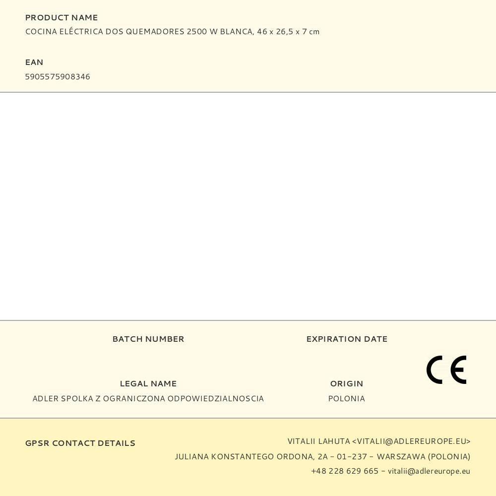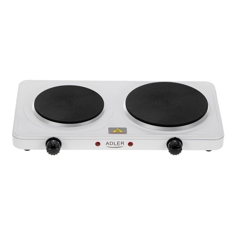 COCINA ELÉCTRICA DOS QUEMADORES 2500 W BLANCA, CARCASA ACERO, PLACAS Ø185, Ø155 mm, 5 NIVELES DE CALOR, PATAS DE GOMA ANTIDESLIZANTES, LUZ INDICADORA, CABLE LONGITUD 90 cm, 220-240 V ~ 50/60 Hz, 46 x 26,5 x 7 cm