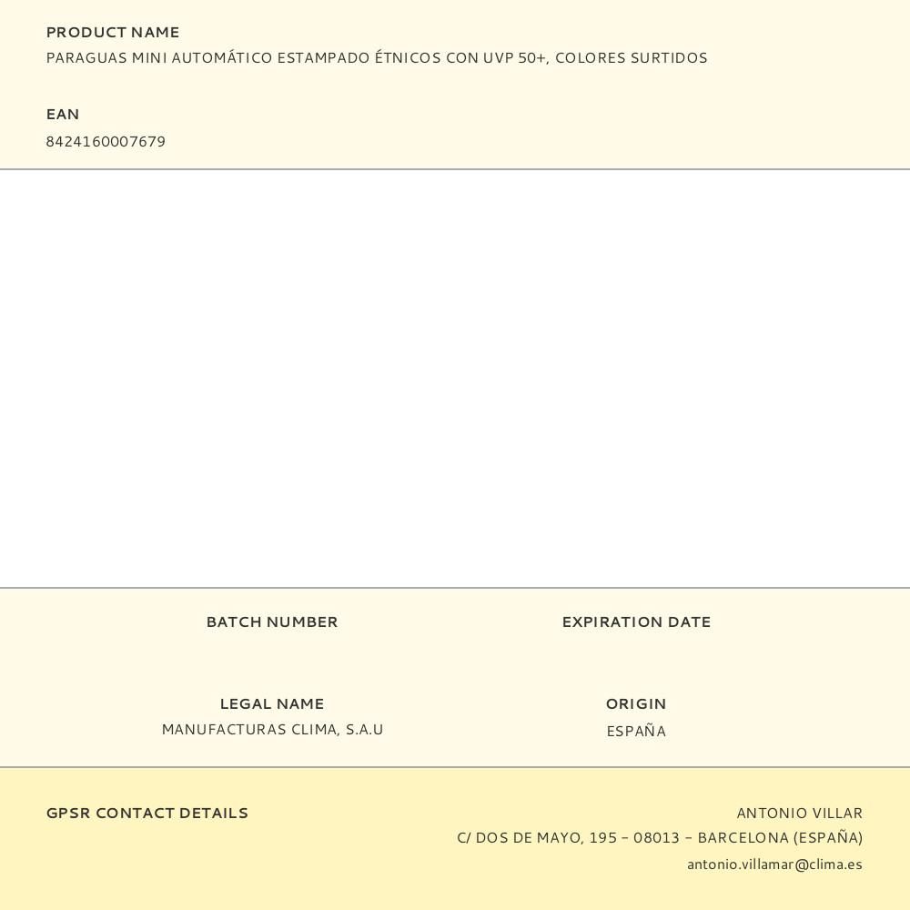 PARAGUAS AUTOMÁTICO ESTAMPADO ÉTNICO CON UV 50+, COLORES SURTIDOS