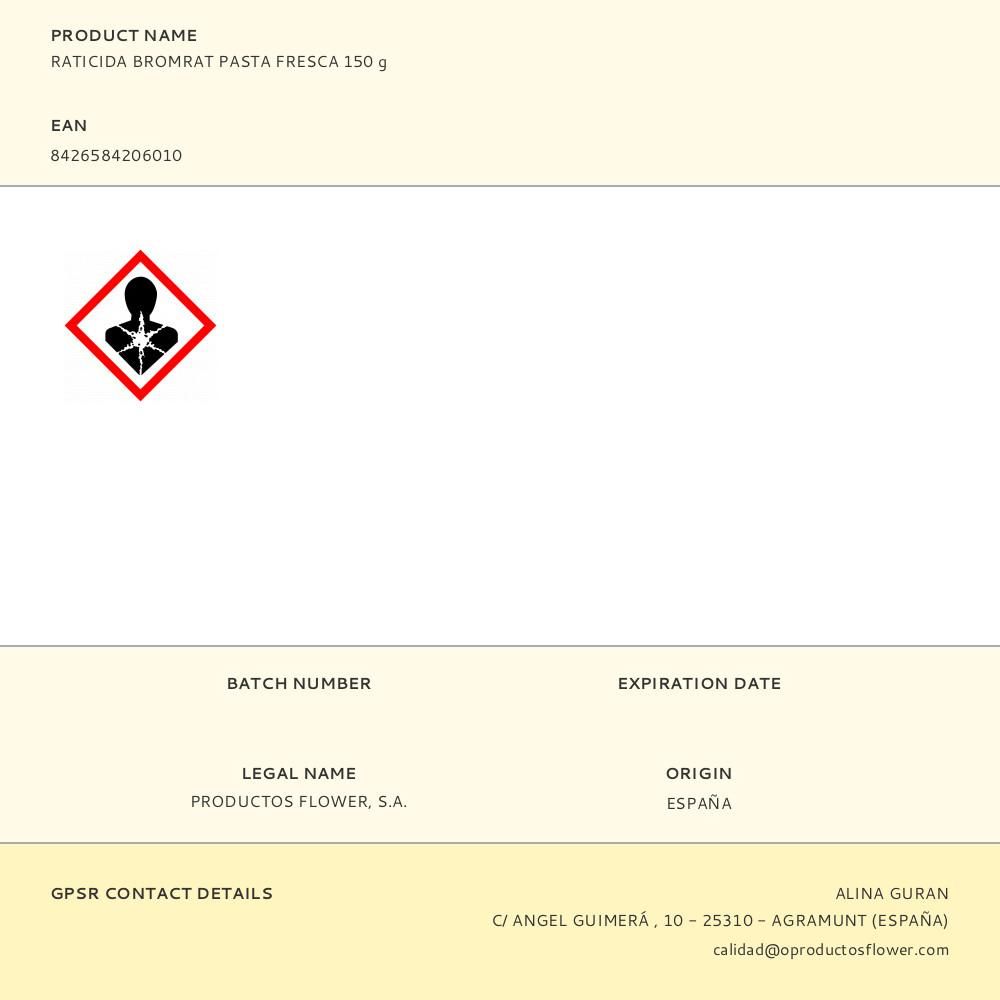 RATICIDA BROMRAT PASTA FRESCA 150 g ES UN PRODUCTO A BASE DE BROMADIOLONA PRESENTADO EN FORMA DE PASTA FRESCA. ES ACTIVO CONTRA ROEDORES RESISTENTES A LA WARFARINA. AUTORIZADO USO DOMÉSTICO