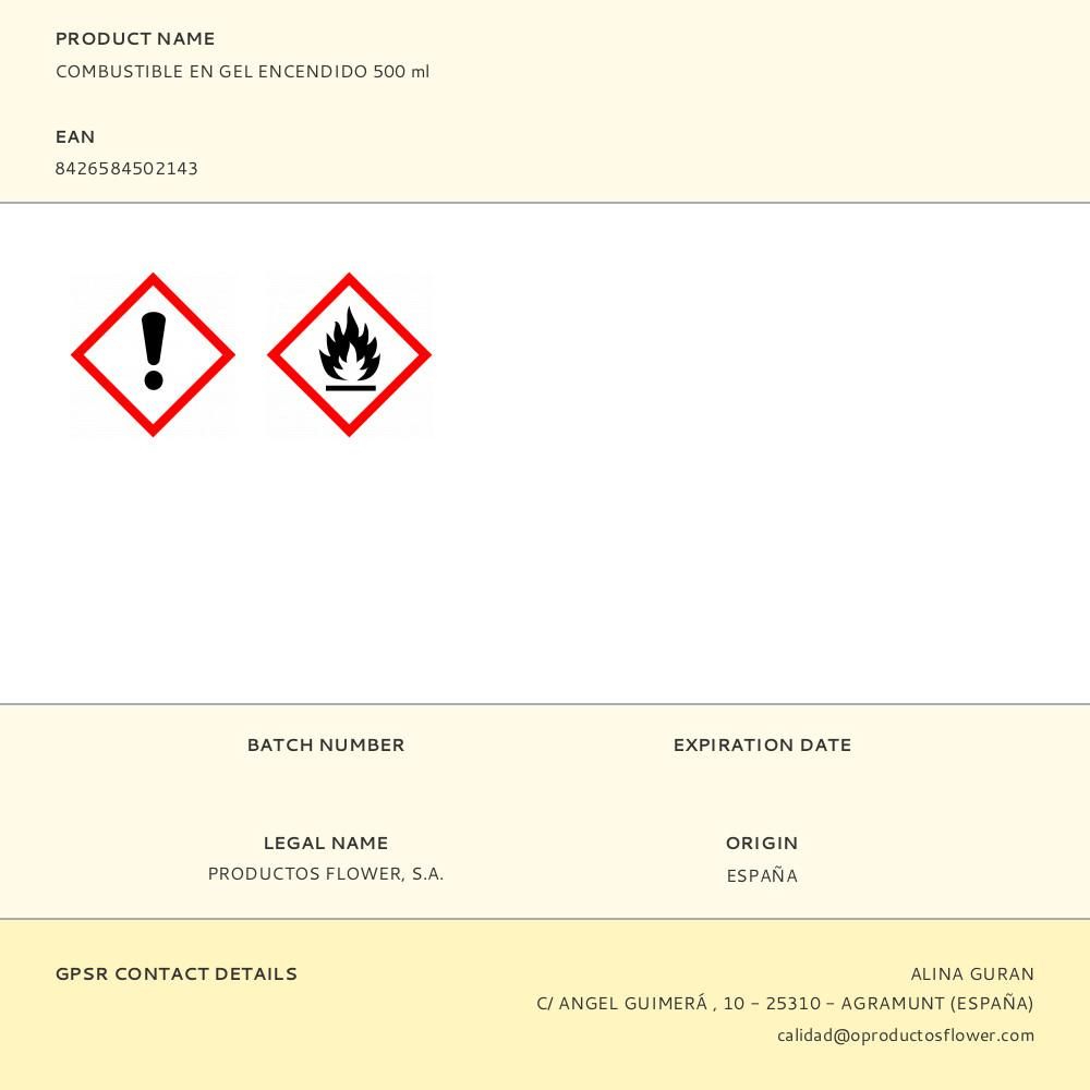 COMBUSTIBLE EN GEL, 500 ml, ES IDEAL PARA UN ENCENDIDO RÁPIDO Y LIMPIO DE BARBACOAS, CHIMENEAS, ETC. AL SER UN PRODUCTO EN GEL, EVITA EL EFECTO RETORNO Y SALPICADURA DEL LÍQUIDO INFLAMABLE, PROPORCIONANDO UN ENCENDIDO SEGURO TANTO DE LA LEÑA Y LAS BRIQUETAS COMO DEL CARBÓN. NO PRODUCE HUMOS NI OLORES