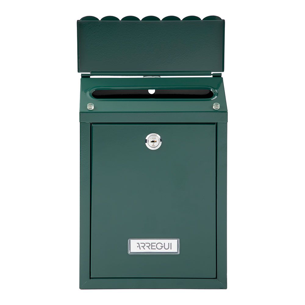 BUZÓN INDIVIDUAL PARA EXTERIOR TAMAÑO S (A5), ACERO GALVANIZADO LACADO VERDE. TAPA SUPERIOR CON FORMA DE TEJADILLO QUE OCULTA LA BOCA, LA PROTEGE DEL AGUA DE LA LLUVIA - APERTURA DE PUERTA LATERAL - INCLUYE TARJETERO, DOS LLAVES Y TORNILLOS - RESISTENTE A LOS RAYOS UV - MEDIDAS: BOCA 17,5 x 2 cm, EXTERIOR 21,6 x 8 x 30 cm