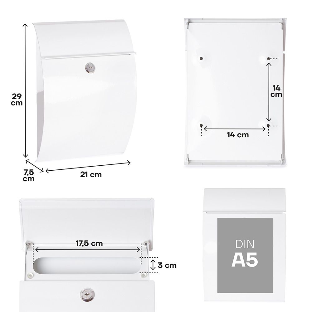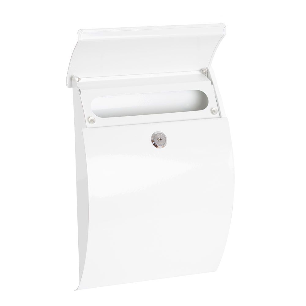 BUZÓN INDIVIDUAL PARA EXTERIOR TAMAÑO S (A5), FABRICADO EN ACERO GALVANIZADO LACADO EN BLANCO, LÍNEAS CURVAS Y APERTURA DE PUERTA VERTICAL - INCLUYE TARJETERO, DOS LLAVES Y TORNILLOS - RESISTENTE A LOS RAYOS UV - MEDIDAS: BOCA 17,5 x 3 cm, EXTERIOR 21 x 7,5 x 29 cm