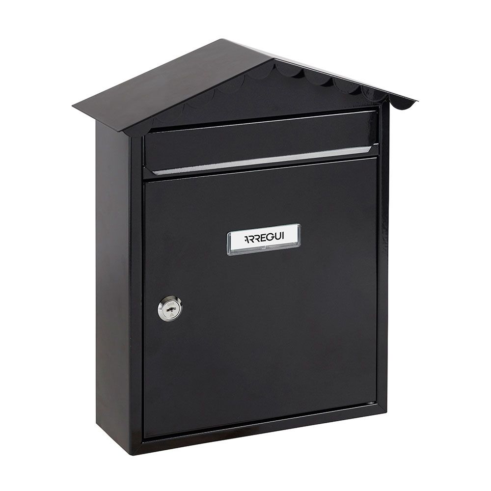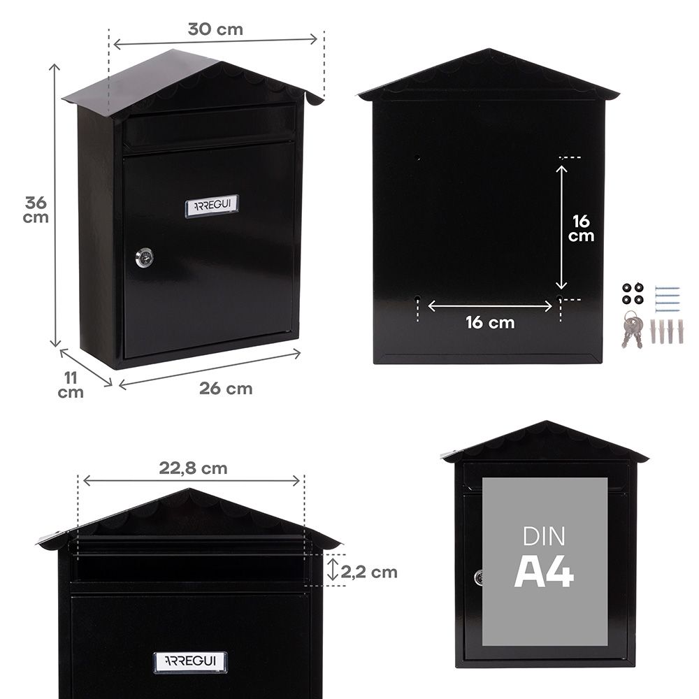 BUZÓN INDIVIDUAL PARA EXTERIOR TAMAÑO M (A4), FABRICADO EN ACERO GALVANIZADO LACADO NEGRO, CON TEJADILLO DECORATIVO QUE REPELE EL AGUA DE LLUVIA - APERTURA PUERTA LATERAL - INCLUYE TARJETERO, DOS LLAVES Y TORNILLOS - RESISTENTE A LOS RAYOS UV - MEDIDAS: BOCA 22,8 x 2,2 cm, EXTERIOR 30 x 11 x 36 cm