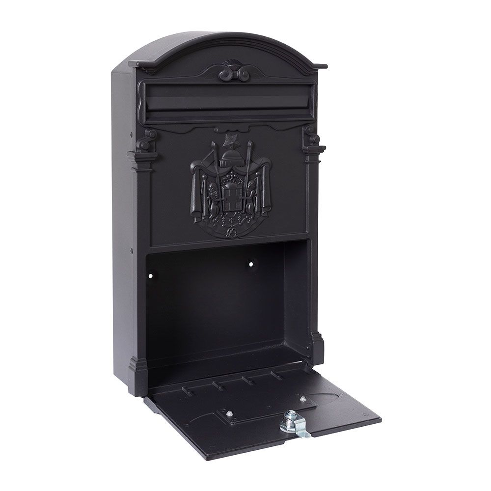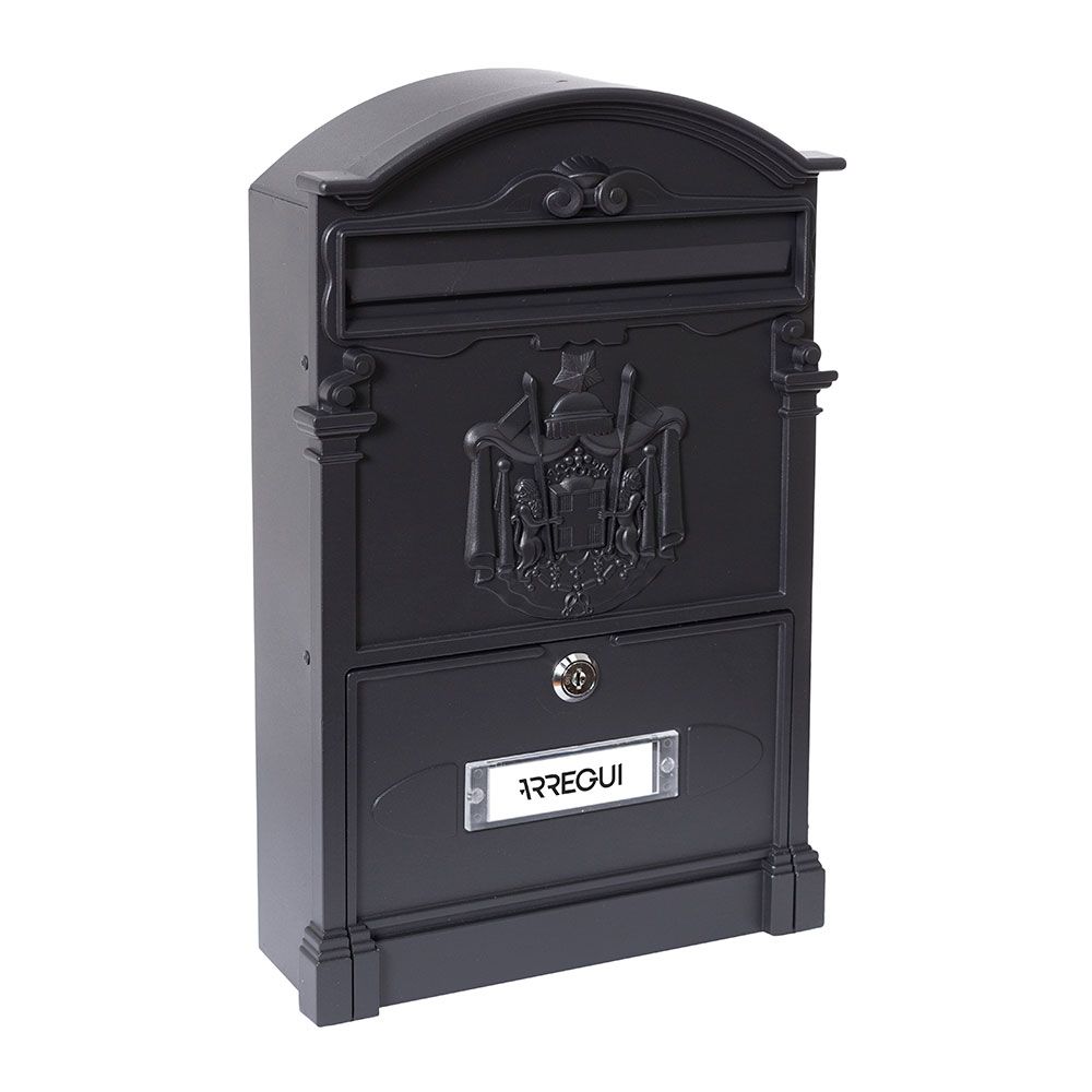 BUZÓN INDIVIDUAL PARA EXTERIOR TAMAÑO M (A4), CUERPO DE ALUMINIO Y TRASERA DE ACERO GALVANIZADO, LACADO NEGRO - BOCA CON MUELLE PARA QUE ESTÉ SIEMPRE CERRADA, SÍMBOLO HERÁLDICO FRONTAL - APERTURA DE PUERTA VERTICAL - INCLUYE TARJETERO, DOS LLAVES Y TORNILLOS - RESISTENTE A LOS RAYOS UV - MEDIDAS: BOCA 22 x 3,5 cm, EXTERIOR 26 x 9 x 42 cm