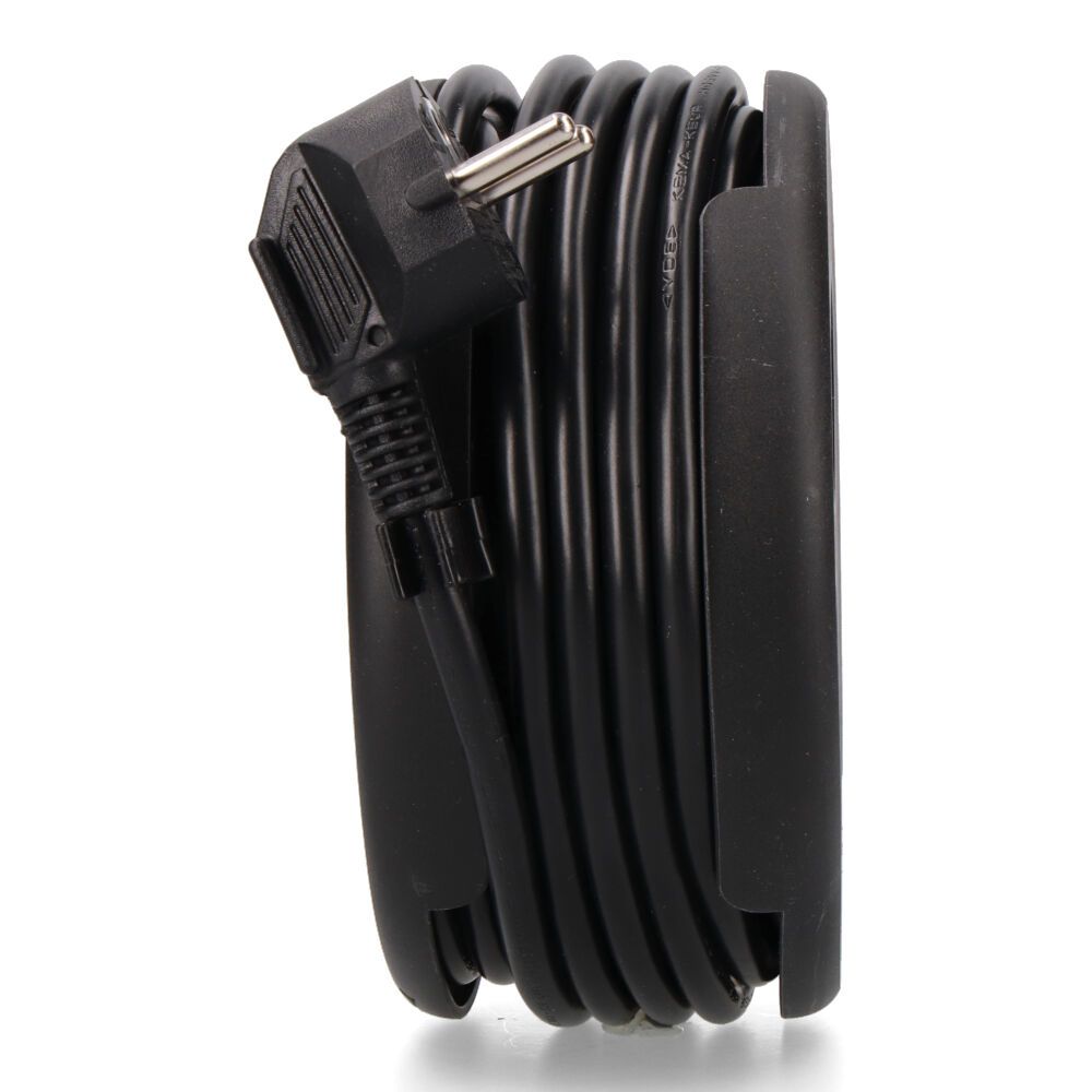 ENROLLACABLES CON 4 TOMAS 2P+T SCHUKO, CON PROTECCIÓN, 16 A 250 V, CABLE H05VV-F 3G1,5mm² DE 5 m, IP20, 1000 W/230 V ENROLLADO, 3000 W/230 V DESENROLLADO, NEGRO, DISPONE DE RANURAS PARA EL MONTAJE EN PARED, DIMENSIONES Ø160 x 75 mm