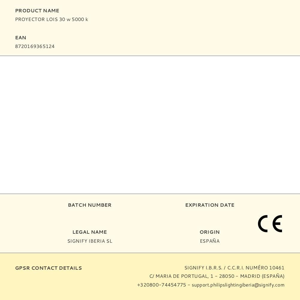 PROYECTOR LOIS NEGRO, LUZ DÍA, 30 W, 3200 lm, FLUJO LUMINOSO 360°, 5000 K, PARA EXTERIOR IP65, 220 - 240 V ~50/60 Hz, VIDA ESTIMADA 15000 h, DIMENSIONES 158 x 28 x 145 mm