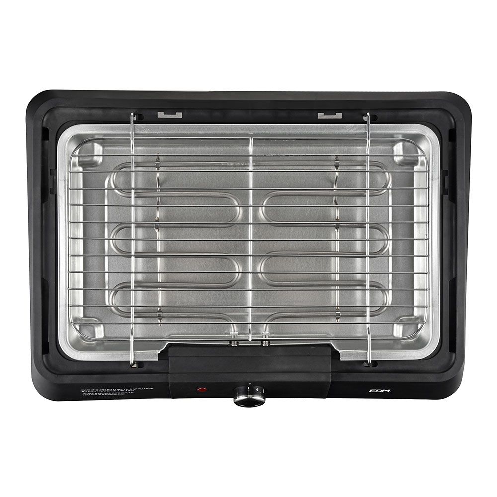 BARBACOA ELÉCTRICA NEGRA, 2200 W, 220-240 V ~ 50-60 Hz, ÁREA DE COCCIÓN 40 x 23 cm, PARRILLA DESMONTABLE, CONTROL AUTOMÁTICO DEL TERMOSTATO, TERMOSTATO REGULABLE NIVELES 1 - 5, CON INDICADOR LUMINOSO, CON MICRO INTERRUPTOR DE SEGURIDAD, CON BANDEJA DE AGUA (USAR SIEMPRE CON AGUA), PATAS ANTIDESLIZANTES, DIMENSIONES DE LA BARBACOA 50 x 34,5 x 9,5 cm