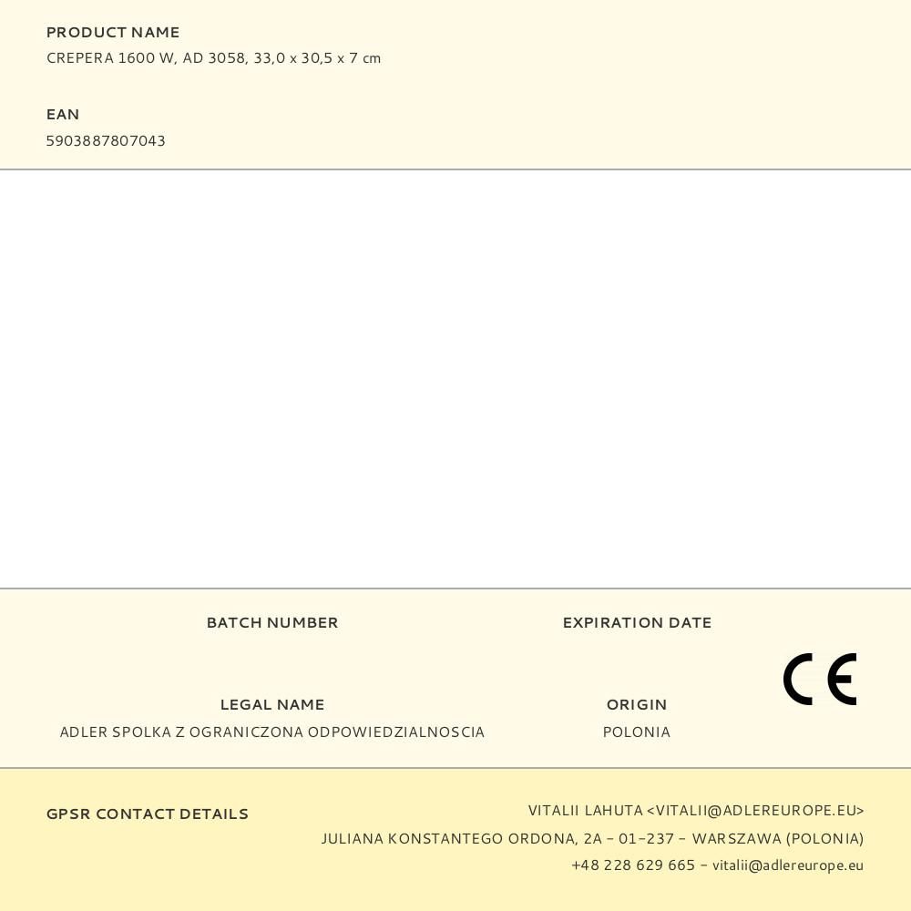 CREPERA AD 3058, 1600 W. MÁQUINA PARA HACER CREPS Y PANQUEQUES, CON PLACA CALEFACTORA Ø30 cm CON RECUBRIMIENTO ANTIADHERENTE, BORDE ALTO PARA EVITAR DERRAMES, CON REGULADOR DE TEMPERATURA Y LUCES INDICADORAS (ENCENDIDO Y LISTO), PATAS DE GOMA ANTIDESLIZANTES, CARCASA ACERO INOX, COMPARTIMENTO PARA EL CABLE DE ALIMENTACIÓN. ACCESORIOS: EXTENDEDOR DE MASA Y LENGUA, POTENCIA: NOMINAL 1200 W, MÁXIMA 1600 W, CABLE 75 cm - 220 - 240 V ~50/60 Hz. MEDIDAS: 33,0 x 30,5 x 7 cm
