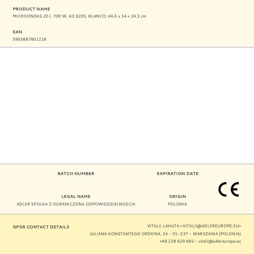 MICROONDAS AD 6205, 700 W, 20 l - 5 NIVELES DE POTENCIA + FUNCIÓN DESCONGELACIÓN, CONTROL MECÁNICO, TEMPORIZADOR HASTA 30 MINUTOS, PLATO GIRATORIO DE Ø24 cm, ILUMINACIÓN INTERIOR - LONGITUD DE CABLE 102 cm - 220-240 V~50-60 Hz - 44,6 x 34 x 24,3 cm
