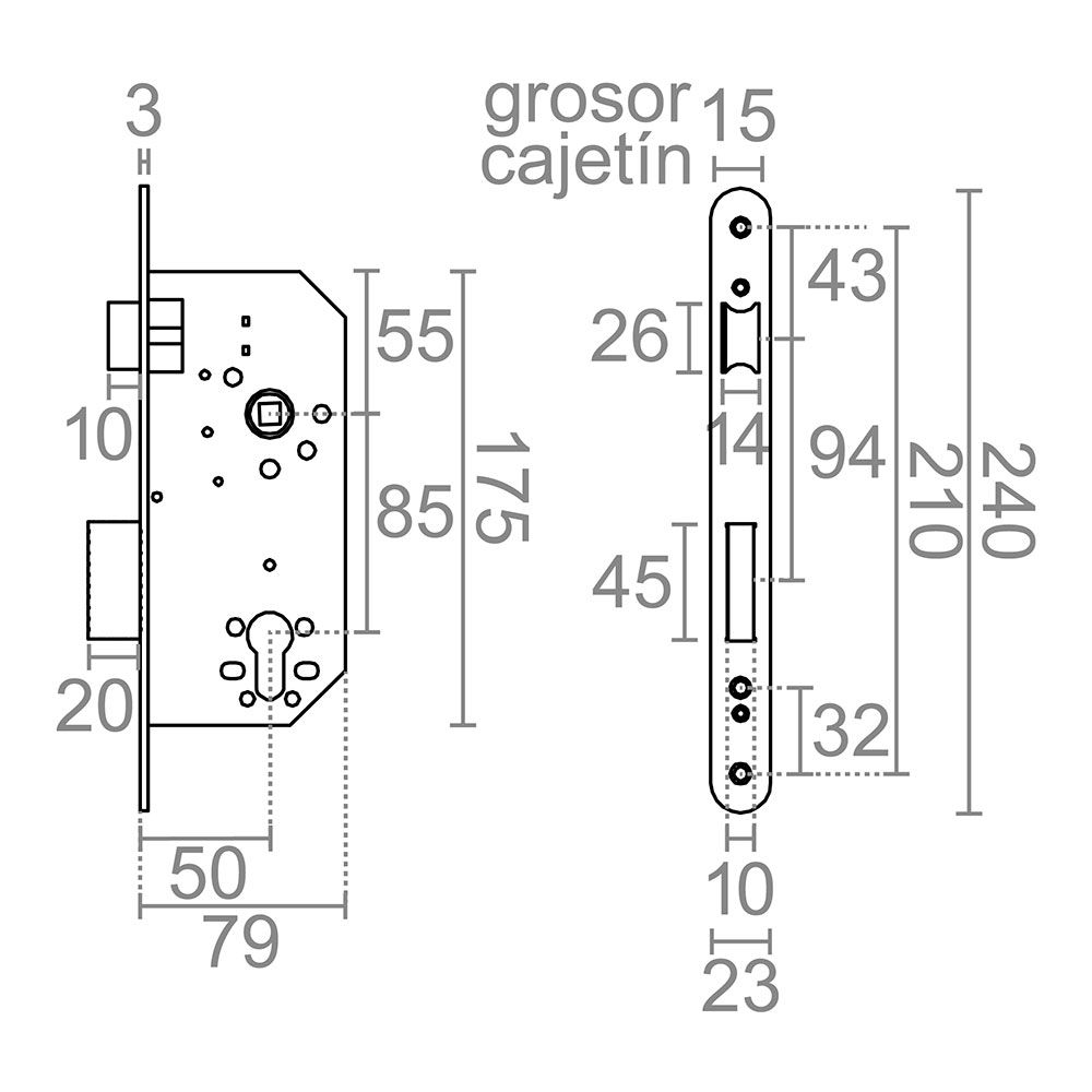 CERRADURA EMBUTIR CRE06 PARA CILINDRO DE PERFIL EUROPEO CON LEVA LARGA (L15) - PARA INSTALAR EN PUERTAS DE CARPINTERÍA DE MADERA, CON CANTO REDONDO, PICAPORTE REVERSIBLE Y NUECA PARA CUADRADILLO DE 8 mm - ESTA CERRADURA TIENE UNA DISTANCIA ENTRE EJES DE 85 mm Y VIENE PREPARADA CON UNA ENTRADA DE 50 mm - NO INCLUYE CILINDRO - CON CAJA CERRADA Y MECANISMO INTERIOR DE ACERO - DESPLAZAMIENTO DE 20 mm (2 VUELTAS) - INCLUYE PROTECTOR DE ESCUDO, CERRADERO Y TORNILLERÍA - FABRICADA EN ACERO, ACABADO EN LATONADO