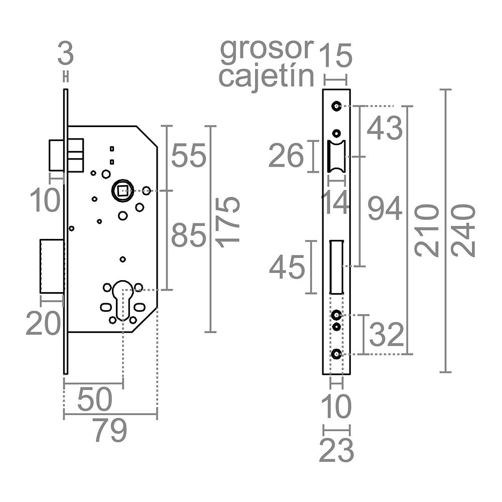 CERRADURA EMBUTIR CRE12 PARA CILINDRO DE PERFIL EUROPEO CON LEVA LARGA (L15) - PARA INSTALAR EN PUERTAS DE CARPINTERÍA DE MADERA, CON CANTO CUADRADO, PICAPORTE REVERSIBLE Y NUECA PARA CUADRILLO DE 8 mm - ESTA CERRADURA TIENE UNA DISTANCIA ENTRE EJES DE 85 mm Y VIENE PREPARADA CON UNA ENTRADA DE 50 mm - NO INCLUYE CILINDRO - INCLUYE PROTECTOR DE ESCUDO, CERRADERO Y TORNILLERÍA - FABRICADA EN ACERO, ACABADO EN LATONADO