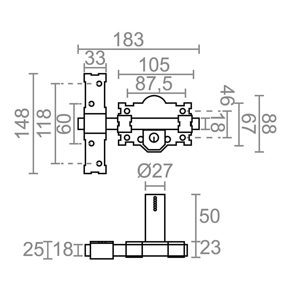 CERROJO DE SOBREPONER CRR07 CON PLACA DE 105 mm Y CILINDRO REDONDO DE 50 mm - PARA REFORZAR LA SEGURIDAD MEDIANTE LA INSTALACIÓN EN CUALQUIER TIPO DE PUERTA - ADEMÁS, AL SER REVERSIBLE NO GUARDA MANO - EL ACCIONAMIENTO SE REALIZA DE MANERA INTERNA Y EXTERNA MEDIANTE LLAVE A TRAVÉS DEL CILINDRO - CON 3 LLAVES DE SERRETA - FABRICADO EN ACERO, ACABADO PINTADO EN GRIS