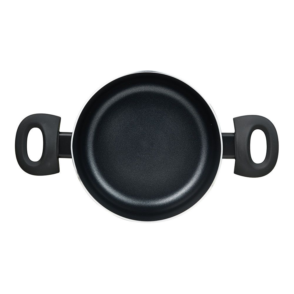 CACEROLA DE ALUMINIO PRENSADO, CON TAPA DE CRISTAL, PARA INDUCCIÓN, ACABADO EXTERIOR VERDE, INTERIOR CON REVESTIMIENTO ANTIADHERENTE NEGRO, EXTERIOR RESISTENTE AL CALOR EN PQ-7764C. ASAS NEGRAS RESISTENTE AL CALOR Y POMO CON TACTO SUAVE. Ø28 x 12 cm