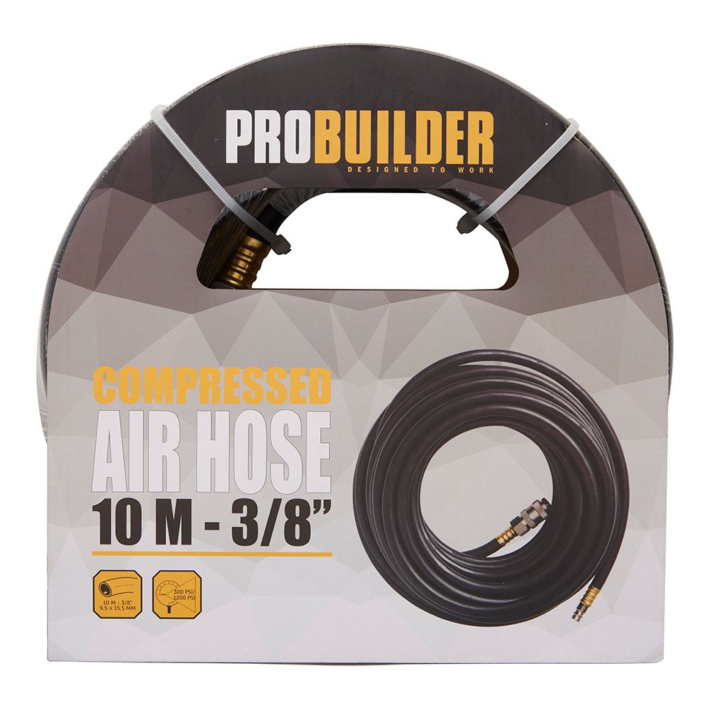 MANGUERA DE AIRE COMPRIMIDO DE CAUCHO 10 m, INCLUYE ACOPLAMIENTO DE MONTAJE RÁPIDO 3/8" Y BOQUILLA CON MANGUITO DE GOMA INCLUIDO 9,5 x 15,5 mm, PRESIÓN DE TRABAJO 300 - 1200 PSI, 80 bar, TEMPERATURA DE TRABAJO -40 A 60°C, NEGRA