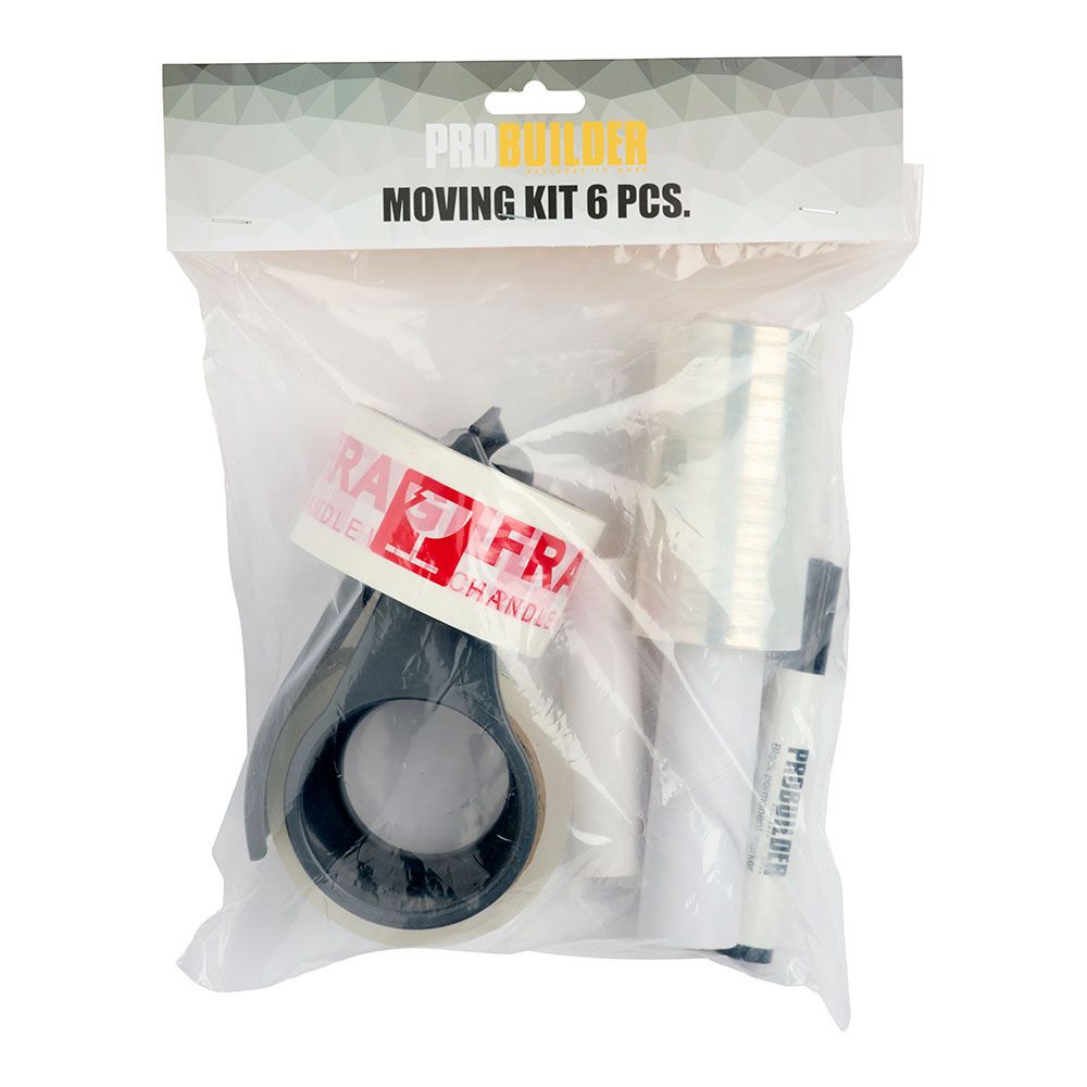 KIT MUDANZA, 6 piezas - COMPUESTO POR: 1 ROLLO FILM 0,1 x 80 m, 1 ROLLO CINTA EMBALAR TRANSPARENTE 0,5 x 50 m, 1 APLICADOR CINTA DE EMBALAR, 1 ROLLO CINTA EMBALAR BLANCA CON TEXTO ROJO (FRÁGIL) 0,5 x 25 m, ROLLO 50 ETIQUETAS BLANCAS Y ROTULADOR PERMANENTE NEGRO