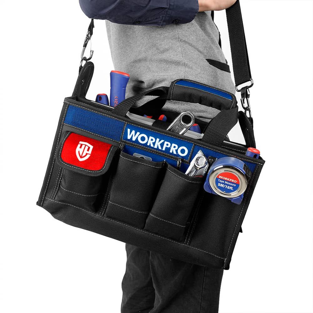 BOLSA DE HERRAMIENTAS CON CORREA AJUSTABLE, PROTECTOR DE ASA REFORZADO - ESTUCHE DE ALMACENAMIENTO DE MÚLTIPLES COMPARTIMENTOS INCLUIDO - 11 BOLSILLOS MULTIUSOS EN EL INTERIOR Y 8 EN EL EXTERIOR PARA ORGANIZAR HERRAMIENTAS Y ACCESORIOS, 39 x 22 x 29 cm