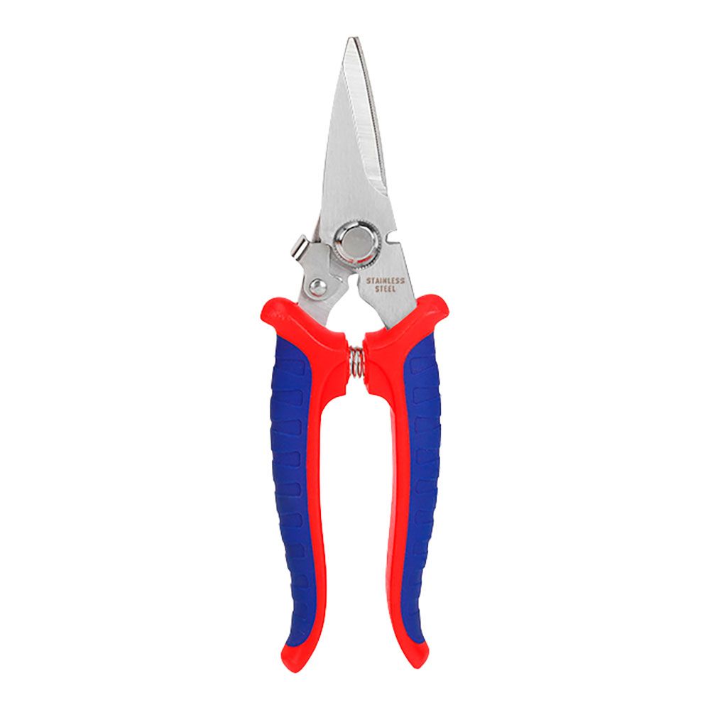 TIJERA MULTIFUNCIÓN 180 mm - HOJAS DE ACERO INOXIDABLE CON FILO SERRADO ANTIDESLIZANTE - RANURA PELACABLES - MANGO BIMATERIAL DE GOMA