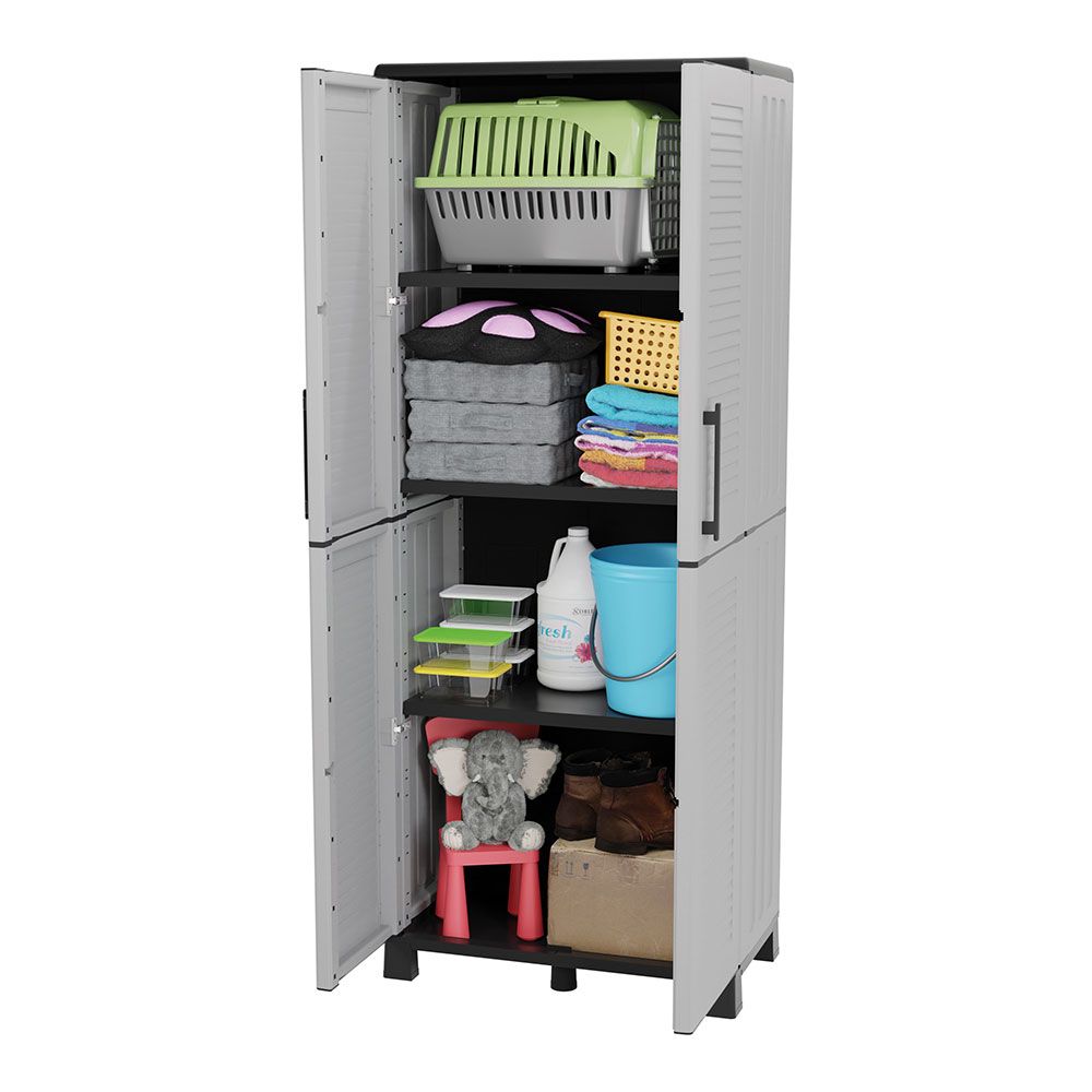 ARMARIO ALTO FABRICADO EN POLIPROPILENO CON PATAS, MATERIAL RECICLABLE, EQUIPADO CON BISAGRAS DE ACERO, ESTANTES INTERIORES AJUSTABLES Y PATAS, CAPACIDAD DE CARGA DE 20 Kg POR ESTANTE, GRIS CLARO, 68 x 37 x 169 cm