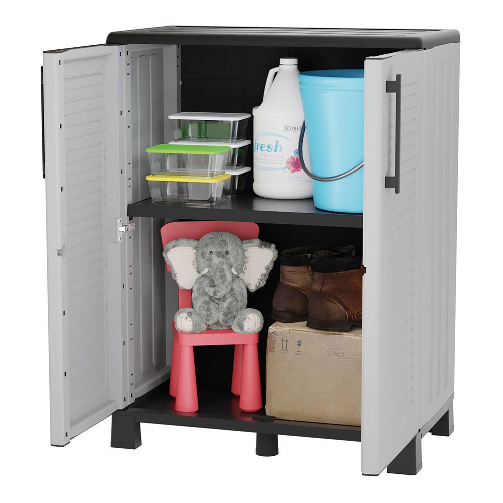 ARMARIO BAJO GRIS FABRICADO EN POLIPROPILENO CON PATAS, MATERIAL RECICLABLE, EQUIPADO CON BISAGRAS DE ACERO, ESTANTE INTERIOR AJUSTABLE Y PATAS, CAPACIDAD DE CARGA: 20 Kg POR ESTANTE DIMENSIONES 680 x 370 x 900 mm