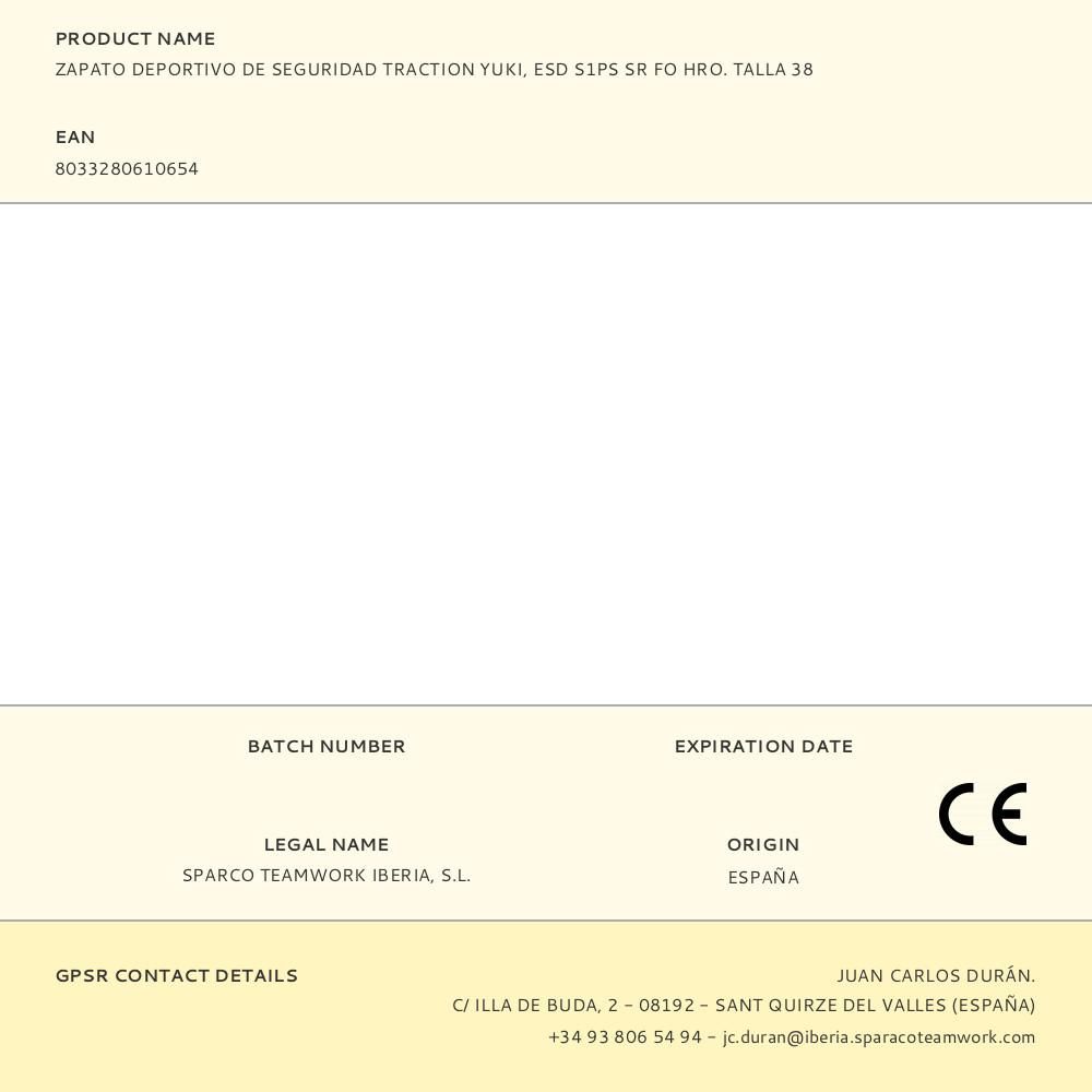 ZAPATO DEPORTIVO DE SEGURIDAD TRACTION YUKI, ESD S1PS SR FO HRO. TALLA 38