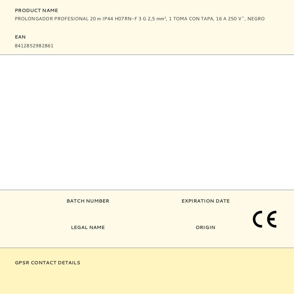 PROLONGADOR PROFESIONAL 20 m, IP44, H07RN-F 3 G 2,5 mm², 1 TOMA CON TAPA, 16 A 250 V~, NEGRO