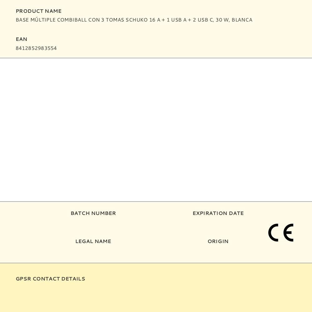 BASE MÚLTIPLE COMBIBALL CON 3 TOMAS SCHUKO 16 A + 1 USB A + 2 USB C, 30 W, BLANCA
