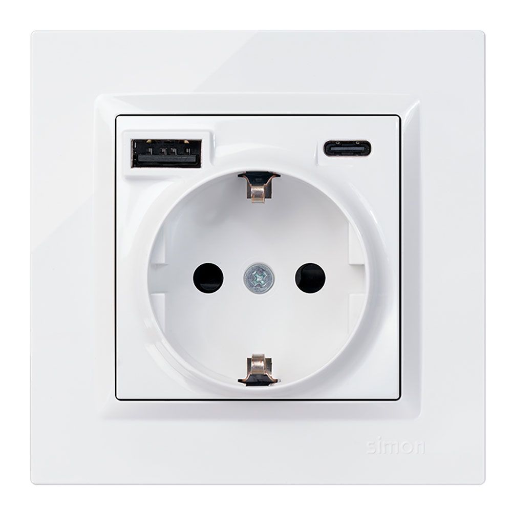 BASE ENCHUFE SCHUKO DE EMPOTRAR 1 TOMA 16 A + USB A+C 10,5 W - SERIE SIMON 10, PERMITE CONECTAR APARATOS DE HASTA 16 A Y 250 V MIENTRAS SE CARGAN MÓVILES U OTROS DISPOSITIVOS A TRAVÉS DE LOS PUERTOS USB A Y C - SE COMPONE DE MECANISMO, TAPA Y MARCO - BASTIDOR DE POLIPROPILENO FLEXIBLE Y GARRAS METÁLICAS - COLOR BLANCO