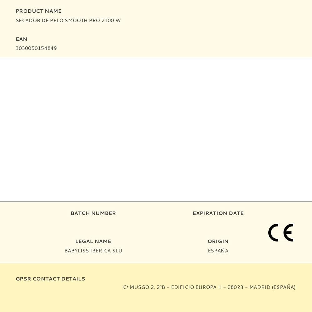 SECADOR DE PELO SMOOTH PRO 2100 W CON MOTOR AC DE LARGA DURACIÓN, GENERA UN FLUJO DE AIRE DE 106 km/h PARA UN SECADO RÁPIDO Y EFICIENTE. DISPONE DE 2 AJUSTES DE TEMPERATURA Y VELOCIDAD, ADEMÁS DE UNA FUNCIÓN DE AIRE FRÍO PARA FIJAR EL PEINADO. SU TECNOLOGÍA IÓNICA NEUTRALIZA LA ELECTRICIDAD ESTÁTICA, DEJANDO EL CABELLO SUAVE Y SIN FRIZZ. INCLUYE UNA BOQUILLA CONCENTRADORA ESTRECHA PARA ALISADO, UN DIFUSOR PARA RIZOS DEFINIDOS Y UN FILTRO TRASERO DESMONTABLE PARA UNA FÁCIL LIMPIEZA. CABLE DE 2,8 m