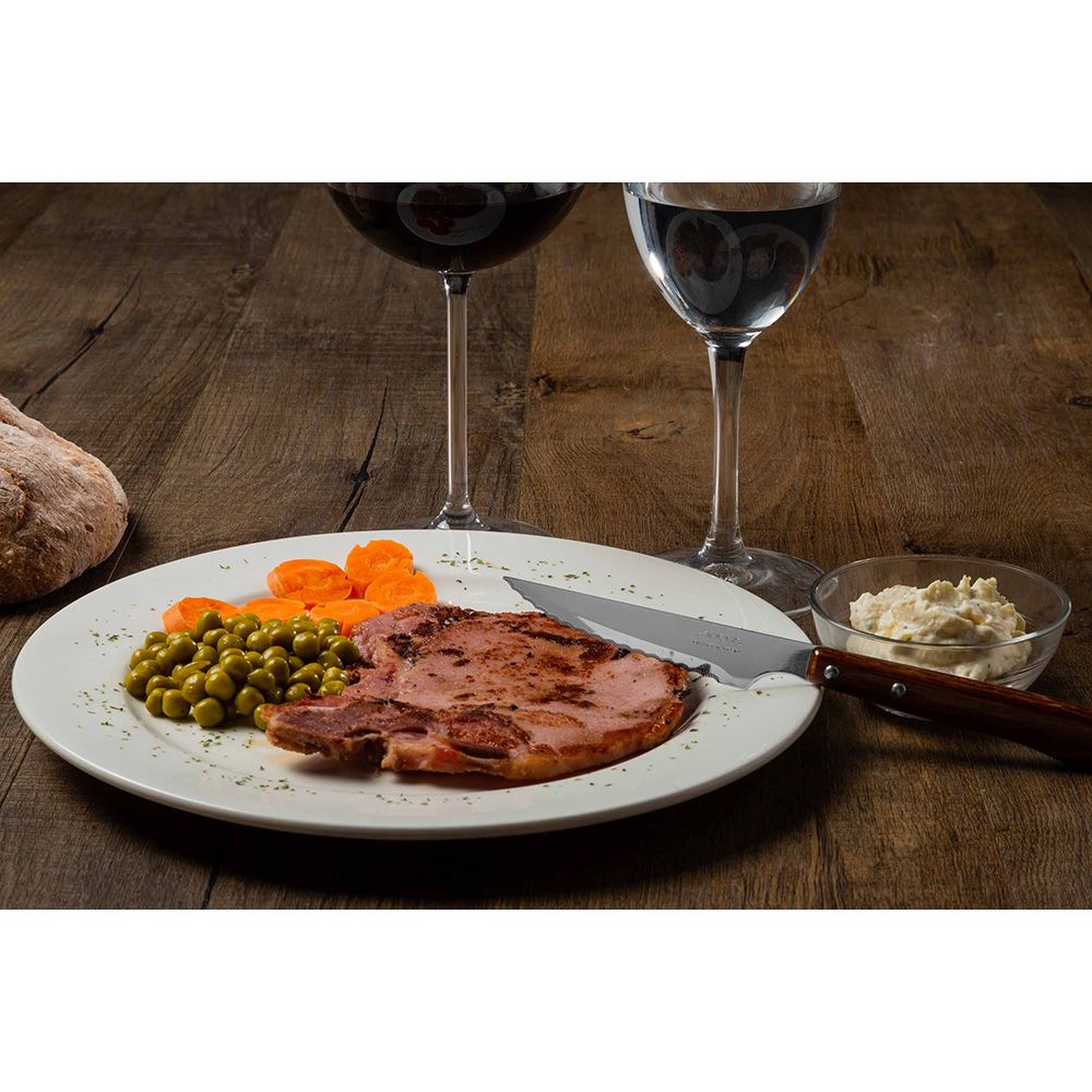 CUCHILLO CHULETERO 105 mm, HOJA ELABORADA EN ACERO INOXIDABLE NITRUM® ULTRARRESISTENTE Y CON MAYOR POTENCIA DE CORTE. CUENTA CON UN FILO CON SIERRA DE LARGA DURACIÓN QUE NO NECESITA AFILARSE. MANGO ERGONÓMICO CONSTRUIDO EN MADERA DE HAYA. CON REMACHES DE ACERO INOXIDABLE. APTO PARA EL LAVAVAJILLAS