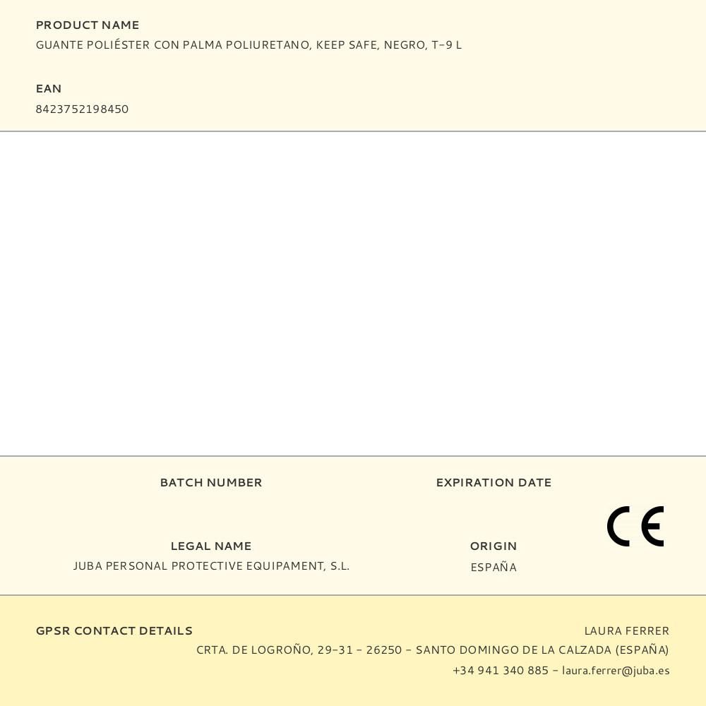 GUANTE KEEP SAFE DE POLIÉSTER CON PALMA PU NEGRO. BUEN TACTO Y TRANSPIRABLE, FLEXIBLE. RECOMENDADOS PARA: BRICOLAJE. TRABAJOS EN EL CAMPO, ALMACENAMIENTO Y REPOSICIÓN. MANIPULACIÓN, MONTAJE Y ENSAMBLAJE DE PIEZAS EN ENTORNOS SECOS, LIGERAMENTE HÚMEDOS O ENGRASADOS. T-9 L