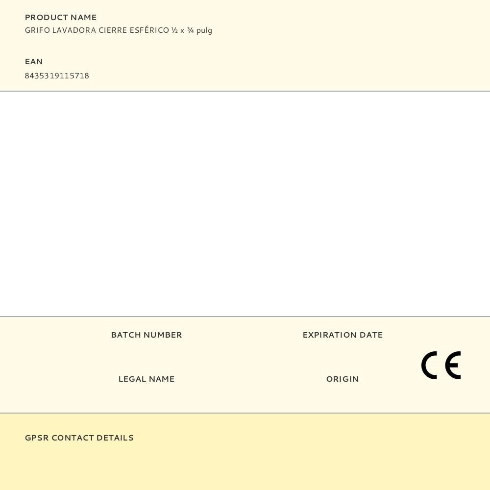 GRIFO DE LAVADORA CON CIERRE ESFÉRICO ؽ x ¾ pulg - CUERPO LATÓN CW617N CROMADO, POMO ABS CROMADO, FLORÓN ACERO INOXIDABLE - ROSCA ISO 228/1 (DIN 259), CIERRE RÁPIDO (1/4 VUELTA), MÁXIMO TRABAJO 10 bar (150 PSI), PROBADA 25 bar (350 PSI), ENTRE 0 A 95°C - USO EN AGUA FRÍA Y CALIENTE - MECANISMO DE CIERRE PLÁSTICO PARA ESCUADRAS ANTICAL