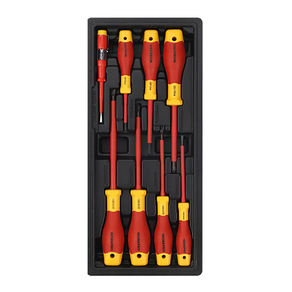 DESTORNILLADORES AISLADOS VDE, JUEGO 8 PIEZAS - EN/IEC 60900 - HASTA 1000 VOLTIOS CA - MANGO ERGONÓMICO ANTIDESLIZANTE - EJE DE ACERO S2 - CONTIENE: 3 DESTORNILLADORES PHILLIPS VDE: PH0 x 60 mm, PH1 x 80 mm, PH2 x 100 mm - 4 DESTORNILLADORES PLANOS VDE: 3.5 x 100 mm, 4 x 100 mm, 5.5 x 125 mm, 6.5 x 150 mm - 1 COMPROBADOR DE TENSIÓN VDE 3 x 140 mm