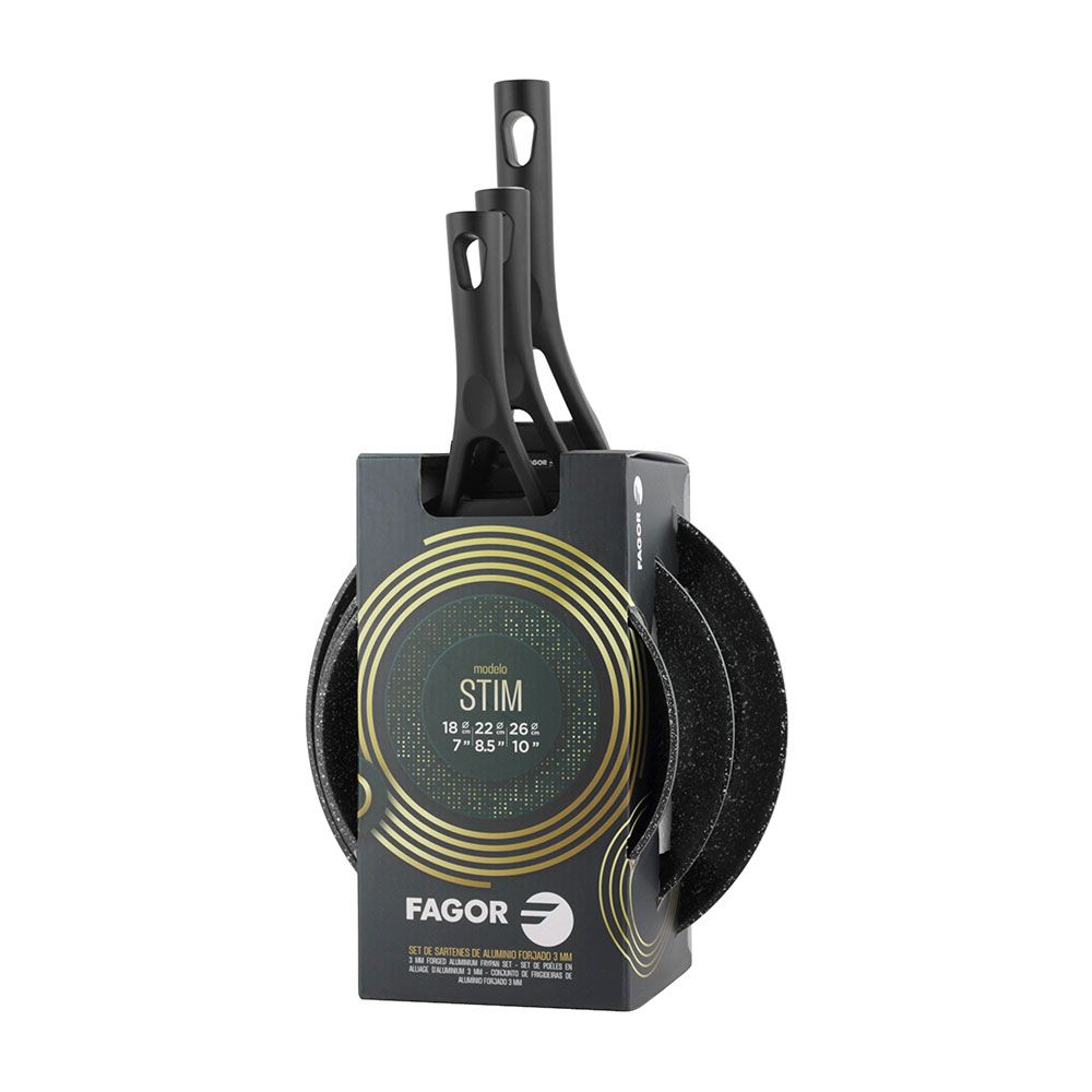 SET 3 SARTENES STIM Ø18 / Ø22 / Ø26 cm. ALUMINIO FORJADO DE GROSOR 3 mm, FONDO TERMODIFUSOR TOTAL INDUCCIÓN. ANTIADHERENTE DOS CAPAS XYLAN® PLUS LIBRE DE CADMIO Y PFOA, 0.0% DE METALES PESADOS. MANGOS ERGONÓMICOS DE BAQUELITA TERMOAISLANTE, APTAS PARA TODO TIPO DE FUEGOS, ESPECIAL INDUCCIÓN
