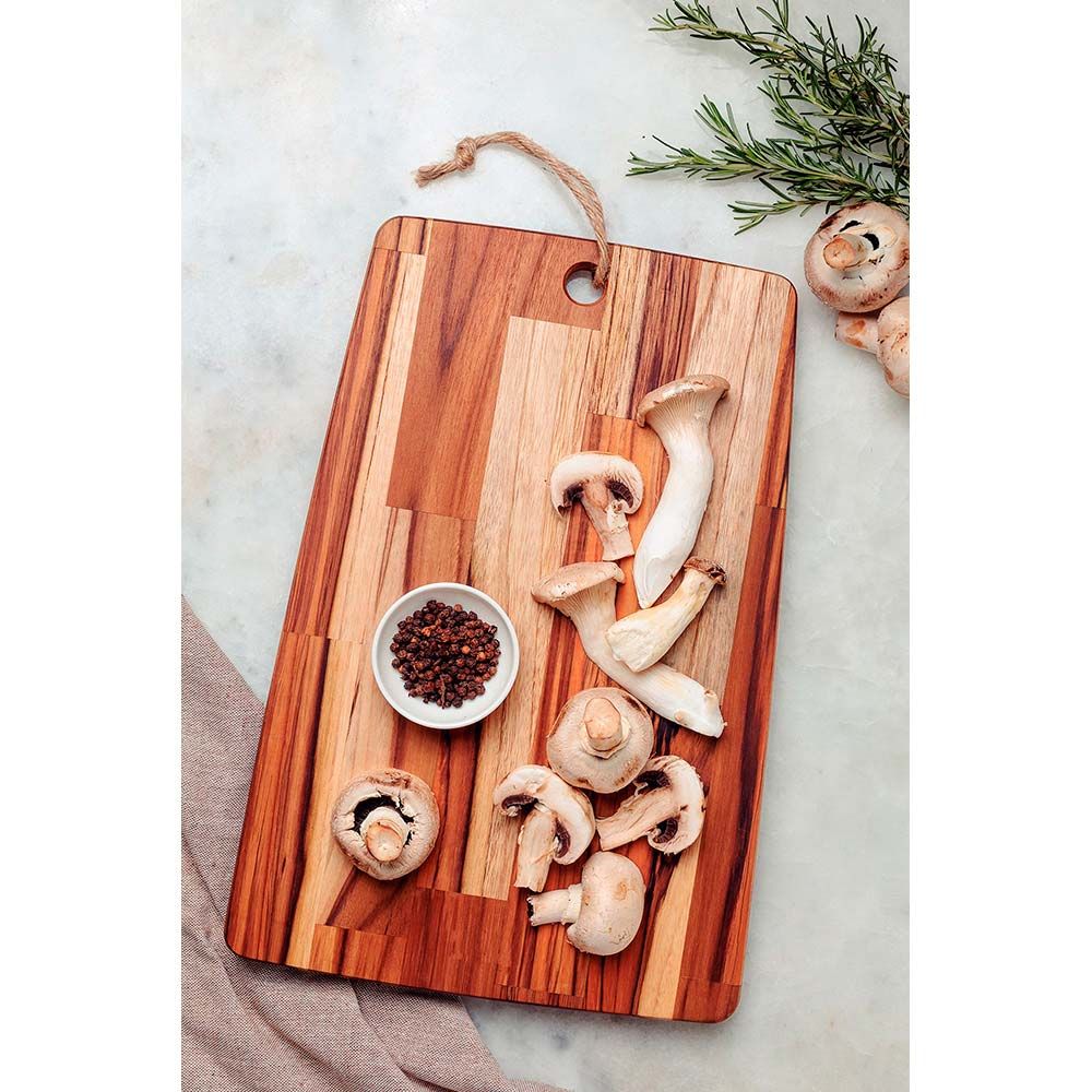 TABLA PARA CORTAR RECTANGULAR EN MADERA DE TECA FSC® CON ACABADO EN ACEITE MINERAL QUE PROTEGE LA MADERA, REALZA SU BELLEZA NATURAL Y ASEGURA UNA SUPERFICIE MÁS HIGIÉNICA Y RESISTENTE A LA HUMEDAD. INCLUYE UNA CUERDA DE SISAL QUE PERMITE COLGARLA CON FACILIDAD. DIMENSIONES 40 × 28 x 1,8 cm